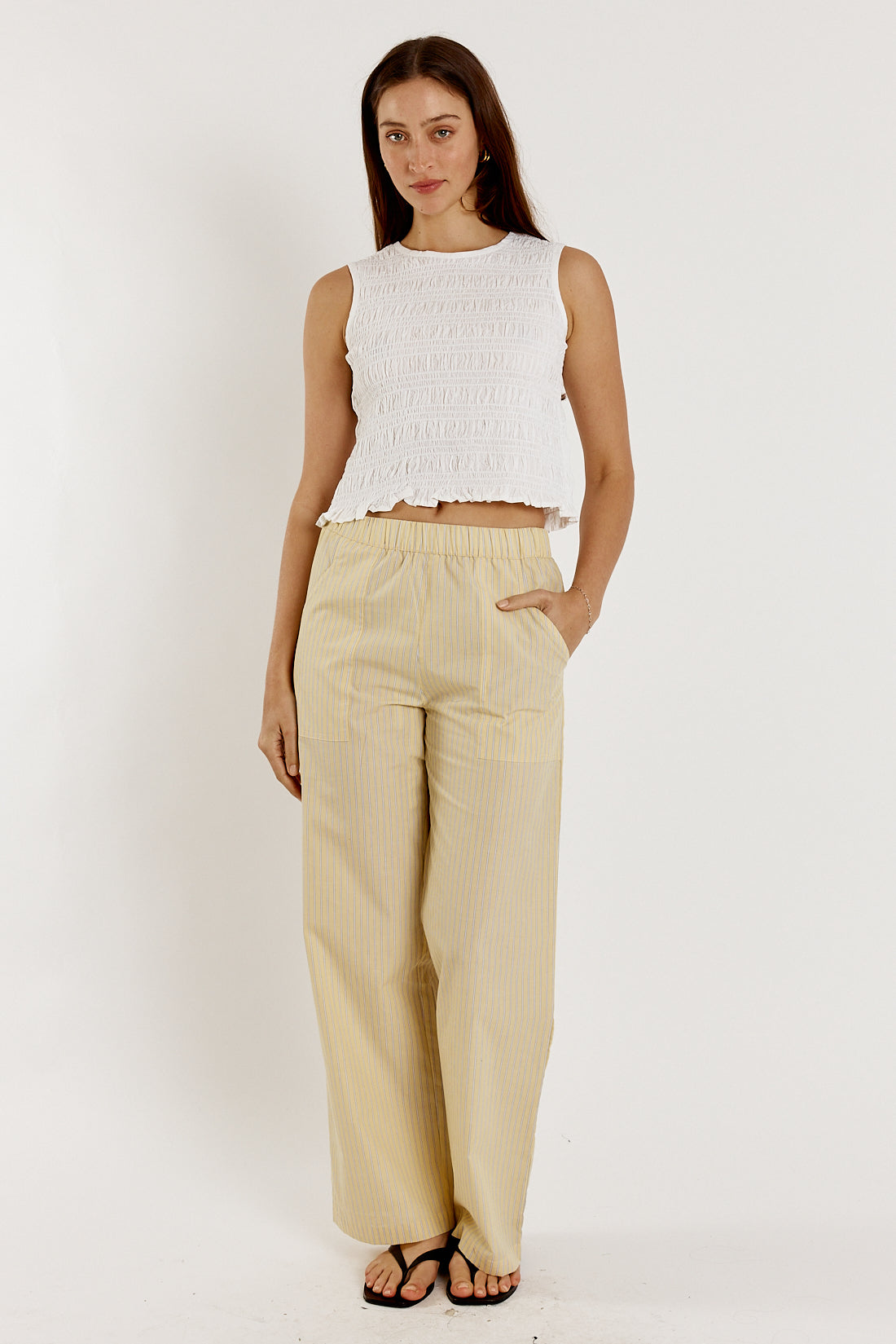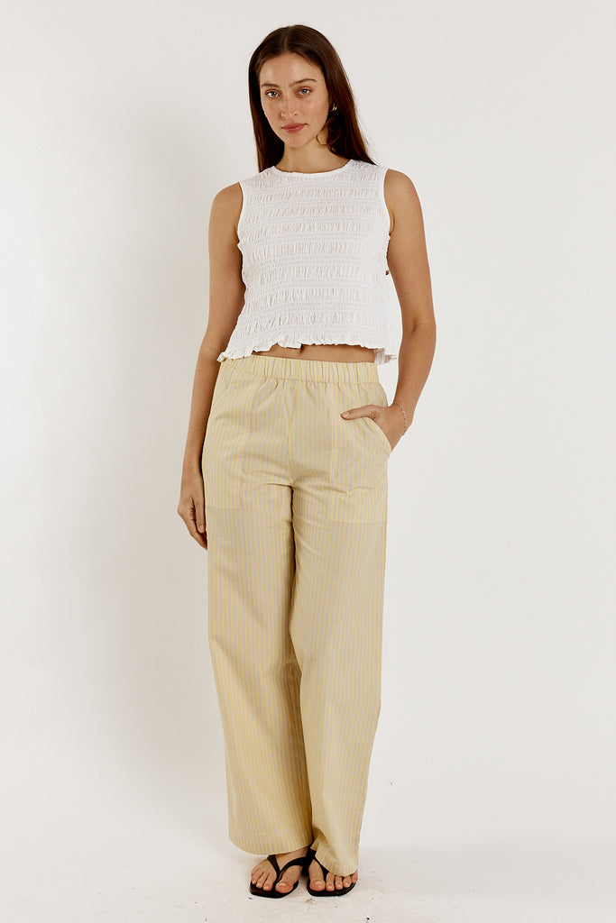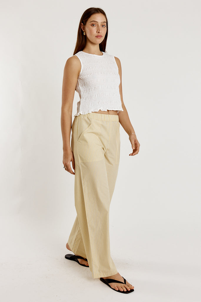 A beautifully textured cotton top featuring a shirred bodice and tie-up back. Feminine, flattering and made for sunny days out.
