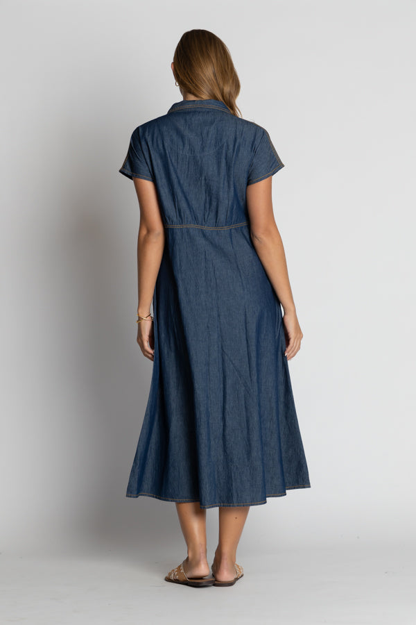 Step out in relaxed sophistication with the IBSA Alabama Midi, a timeless collared dress crafted from lightweight 100% cotton denim. Designed in Australia, it features a button-through front, empire seam, and flattering A-line silhouette that moves with ease. Short sleeves and contrast topstitching add a refined yet contemporary touch, while side pockets bring practicality to your everyday look. Perfect for styling up or down, this versatile midi dress embodies effortless charm and comfort in one easy piece.
