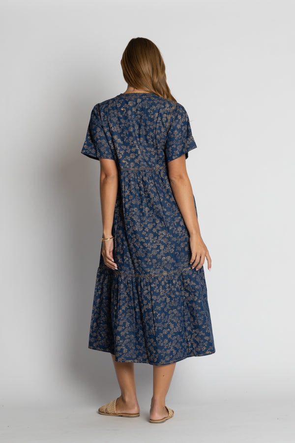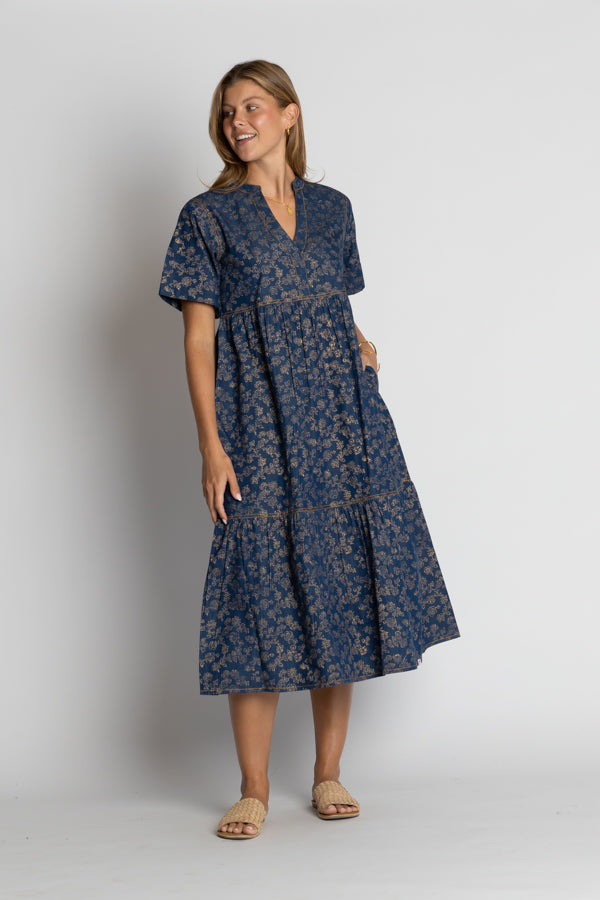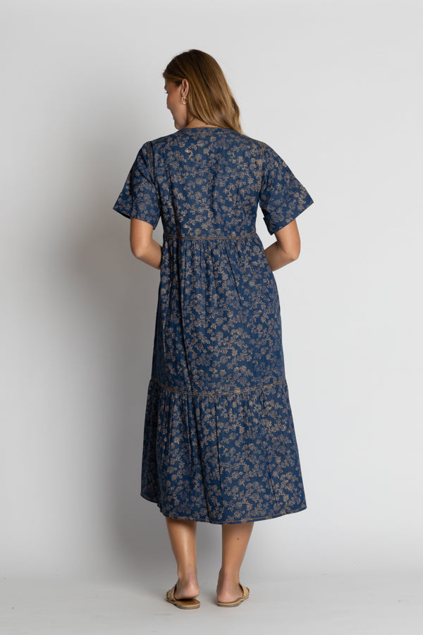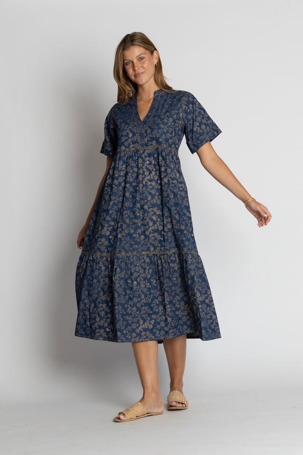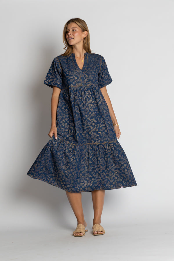 The IBSA Amarillo Midi combines effortless style with everyday practicality. Crafted from lightweight denim cotton, this tiered midi dress moves beautifully with you while staying cool and comfortable. A striking gold foil print adds a touch of shimmer and sophistication to your wardrobe. Functional pockets keep your essentials close, because looking great shouldn't mean sacrificing convenience. Perfect for casual outings or dressed up for something special.