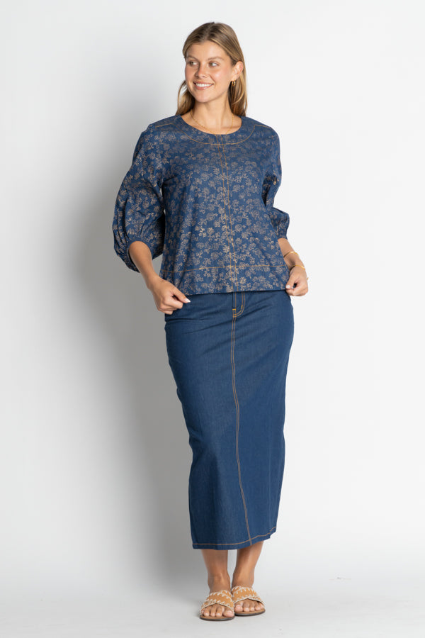 The IBSA Amarillo Top brings effortless style to your everyday wardrobe. Crafted from quality denim cotton, this piece features a charming puff sleeve design that adds dimension and movement. The round neckline offers a flattering, comfortable fit, while eye-catching gold foil print and contrast gold stitching create a polished, contemporary look. Perfect for dressing up or down, this top celebrates your individual style with thoughtful details that make you feel confident and put-together.