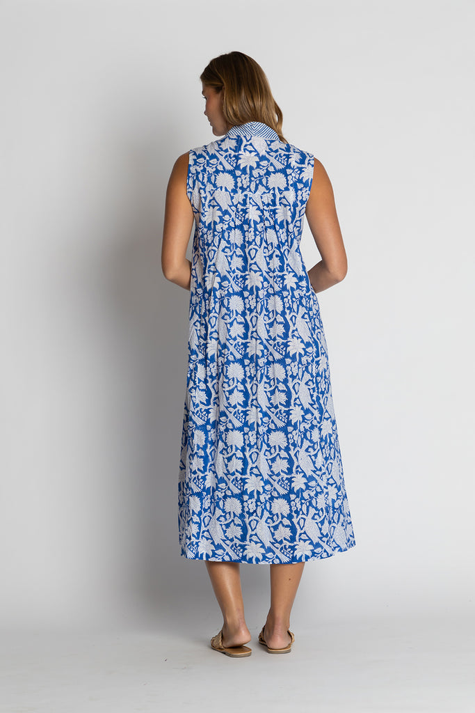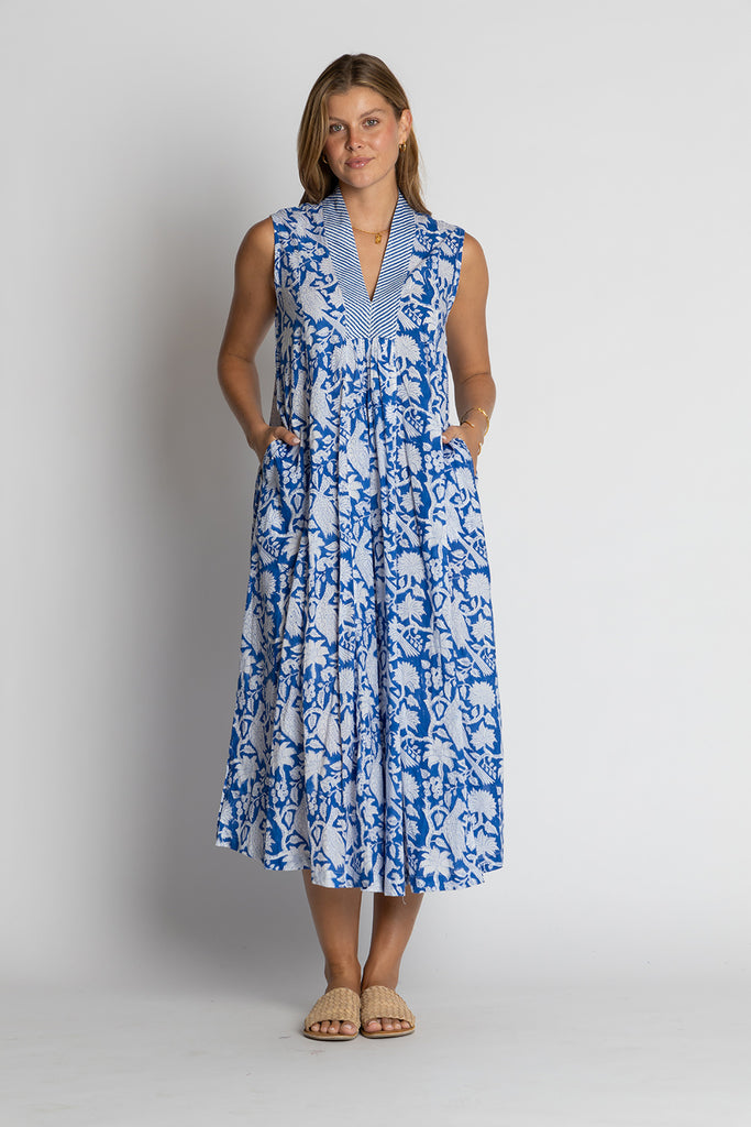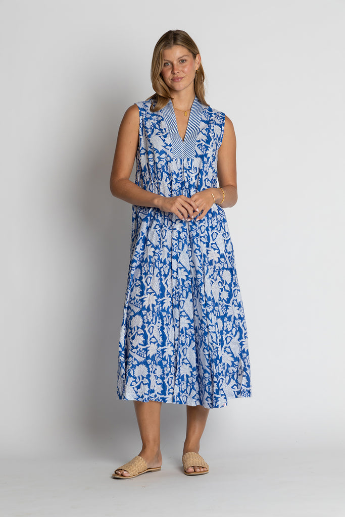 The IBSA Carolina Midi Dress brings timeless charm and comfort to your everyday wardrobe. Designed in Australia, this A-line cotton midi features a flattering V-neck with a contrast stripe band and soft gathers that create gentle movement and shape. The back yoke detailing and side pockets add both functionality and refined design. Falling below the calf, this printed 100% cotton dress is breathable, stylish, and perfect for relaxed weekends, workdays, or warm-weather getaways.