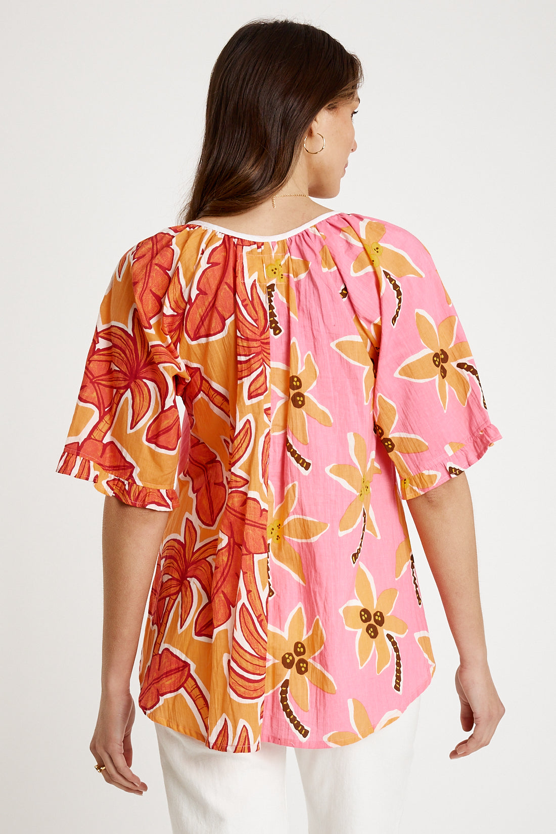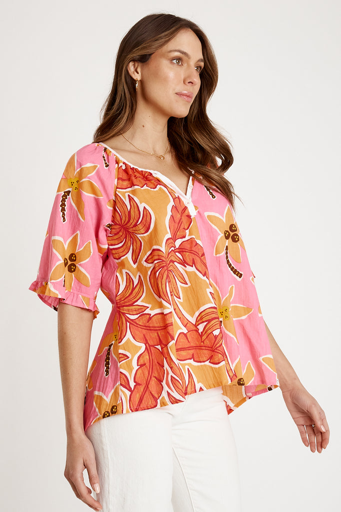 Effortless, detailed, and full of personality, the I.B.S.A Omaha Top brings a fresh twist to the classic peasant silhouette. Made from 100% cotton with soft gathers falling from the neck bind, it offers a relaxed, easy fit that feels great for everyday wear. The chambray trim adds a modern touch, while the raglan sleeves with ruffle hems keep the look feminine and airy. Finished with contrasting prints and a buttoned front tab, this Australian-designed style is perfect for pairing with denim, linen, or your favourite relaxed-fit pants.
