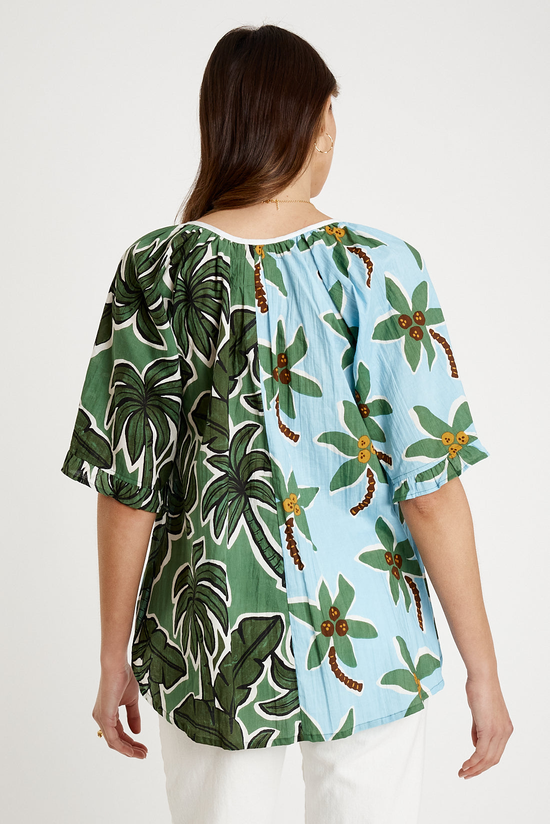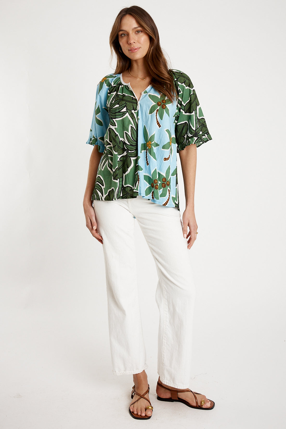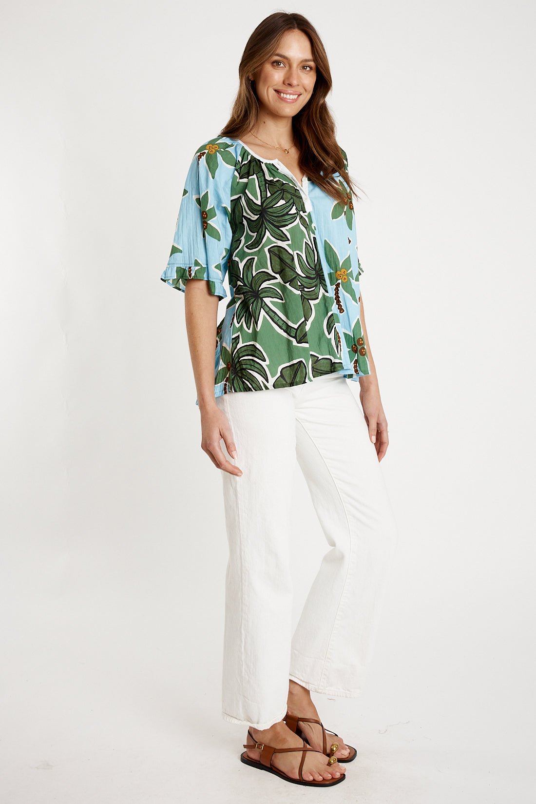 Effortless, detailed, and full of personality, the I.B.S.A Omaha Top brings a fresh twist to the classic peasant silhouette. Made from 100% cotton with soft gathers falling from the neck bind, it offers a relaxed, easy fit that feels great for everyday wear. The chambray trim adds a modern touch, while the raglan sleeves with ruffle hems keep the look feminine and airy. Finished with contrasting prints and a buttoned front tab, this Australian-designed style is perfect for pairing with denim, linen, or your favourite relaxed-fit pants.