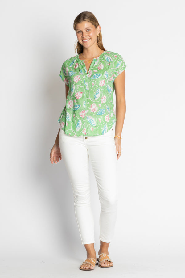 The IBSA Wyoming Top brings laid-back charm and everyday versatility to your wardrobe. Crafted from 100% cotton, this soft and breathable top features a round neckline with gentle gathers, a neat front tab, and capped sleeves for a flattering touch. The relaxed fit and curved hem create a beautifully draped silhouette that pairs perfectly with jeans, linen pants, or tailored shorts. Designed in Australia, this piece blends comfort and polish — ideal for both casual days and weekend outings.