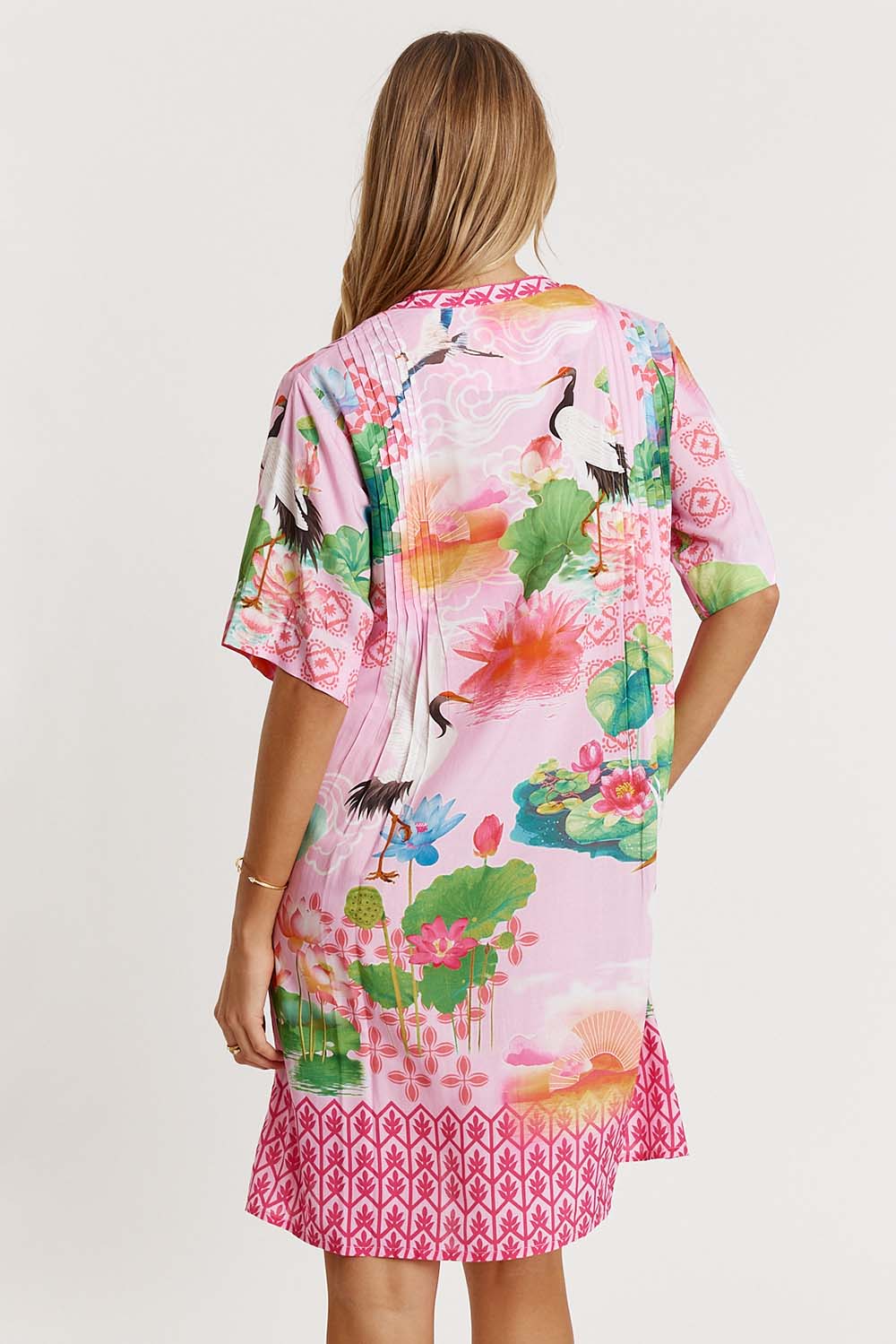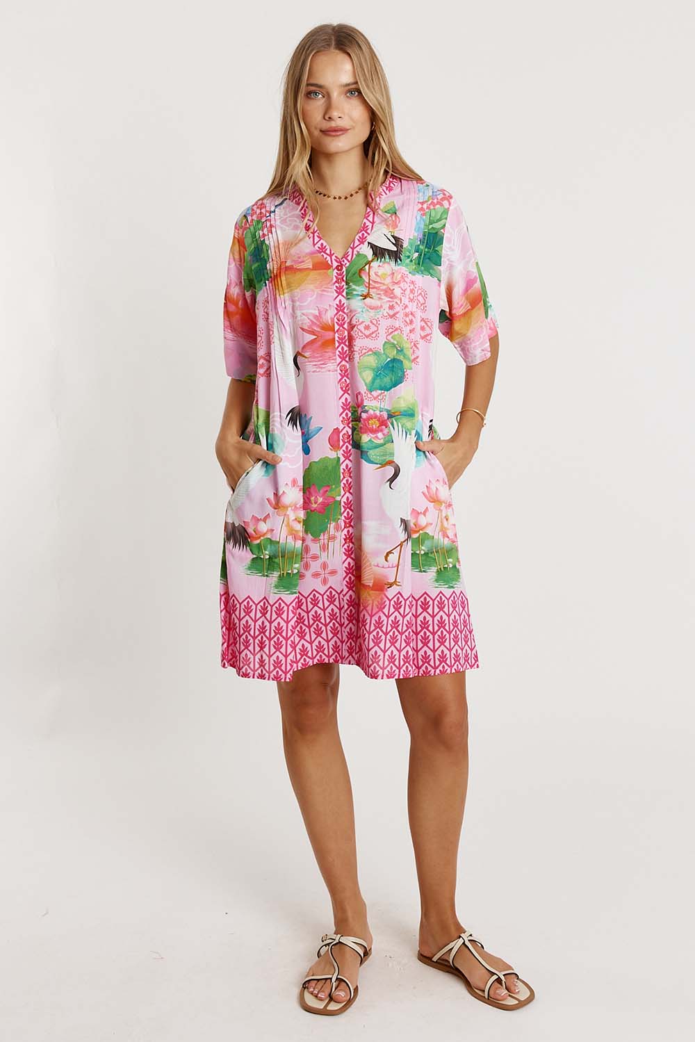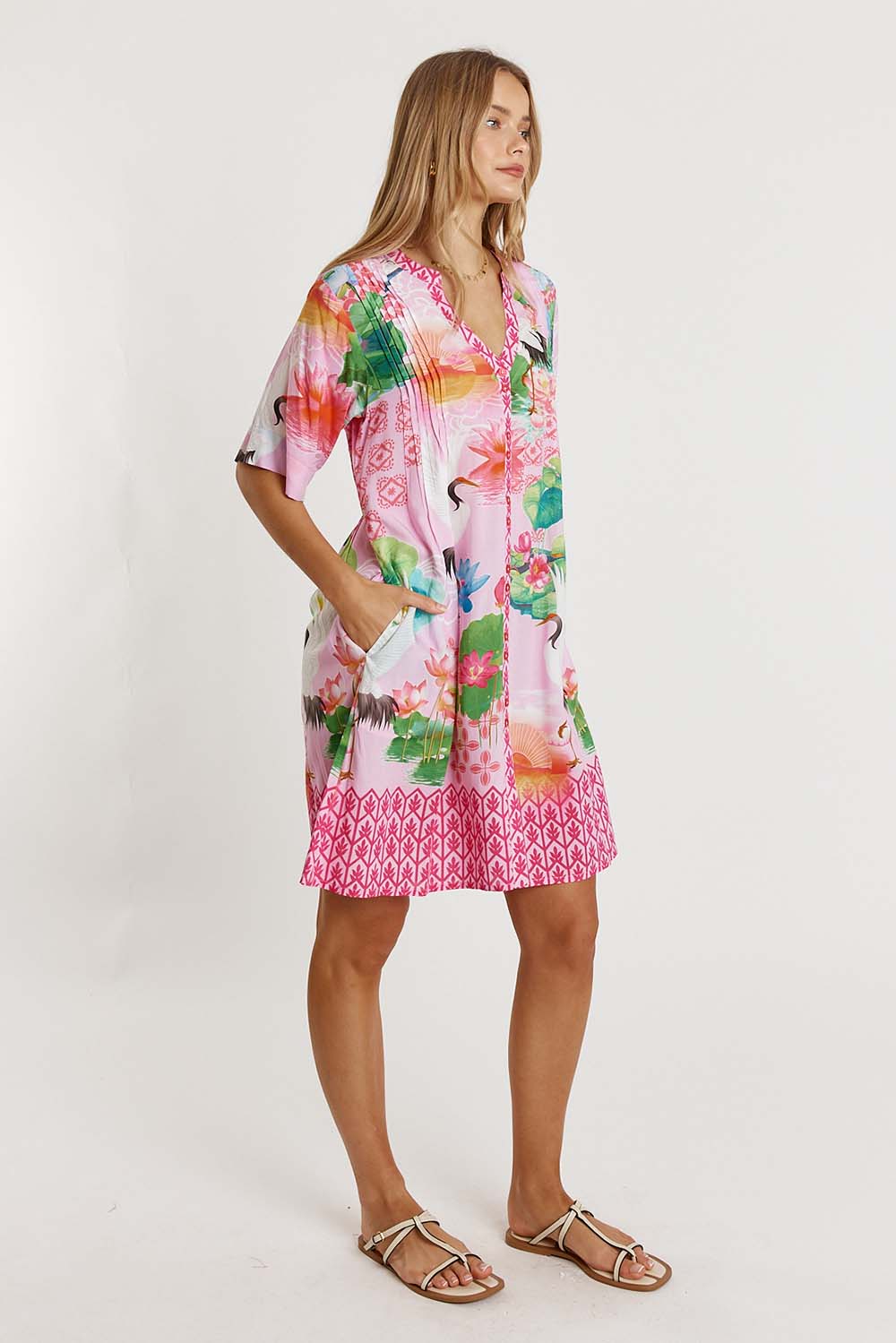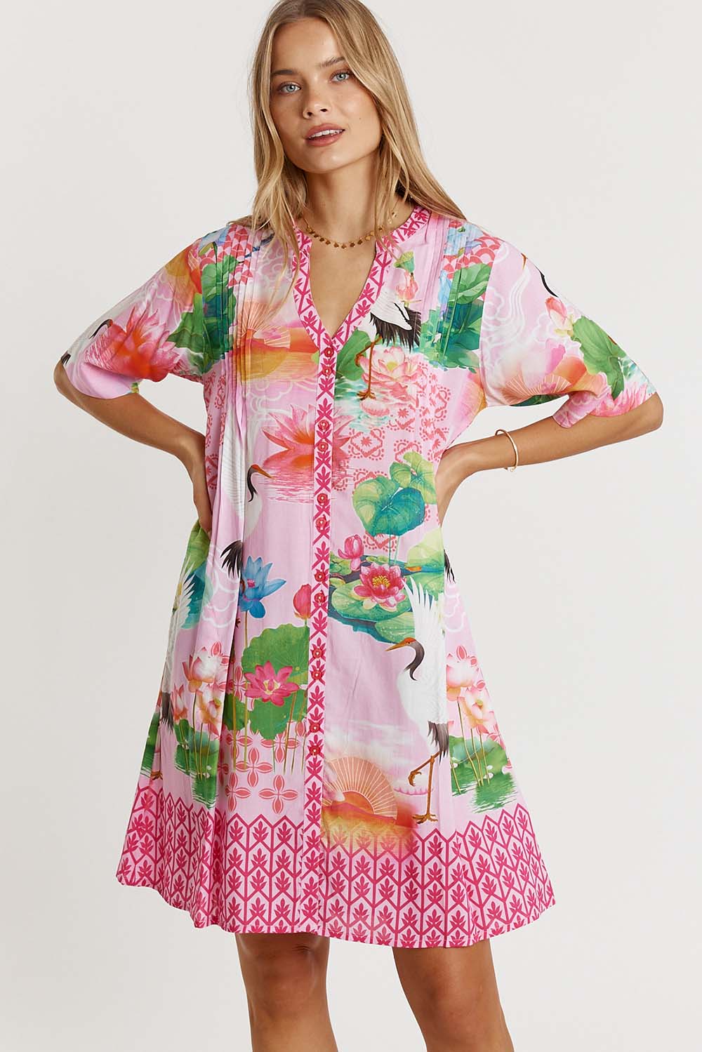 Flowing with effortless charm, the LulaLife Akiko Button Dress is an easy go-to for colourful, everyday style. Made from 100% viscose, it feels soft, cool, and lightweight—perfect for warm days. The Nauru collar with a V-neck, front tab button-through design, and vertical tucks on the front and back bodice create a relaxed yet polished look. With elbow-length sleeves, practical side pockets, and a soft curved hem, it’s finished in a striking Japanese-inspired digital print that adds a fresh, artistic touch. Proudly designed in Australia, it’s ideal for weekends, outings, or effortless daytime dressing.