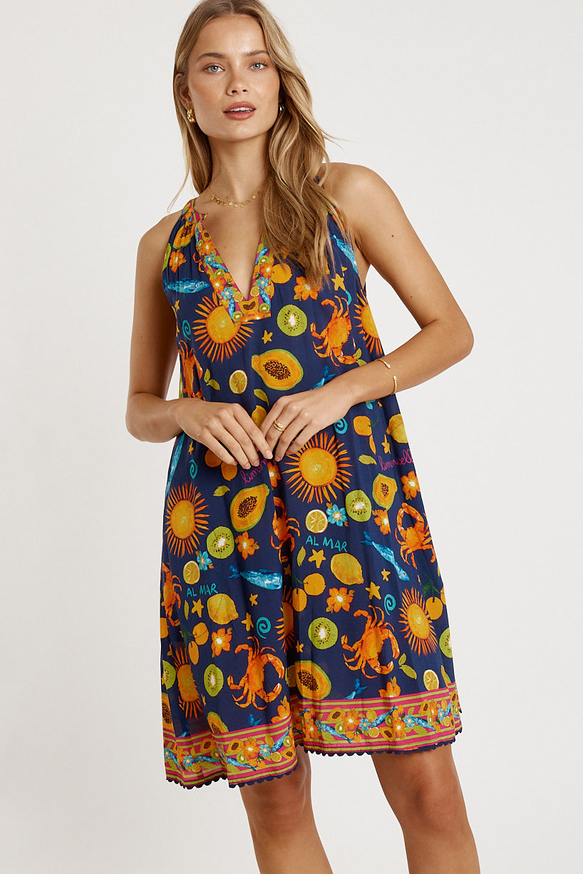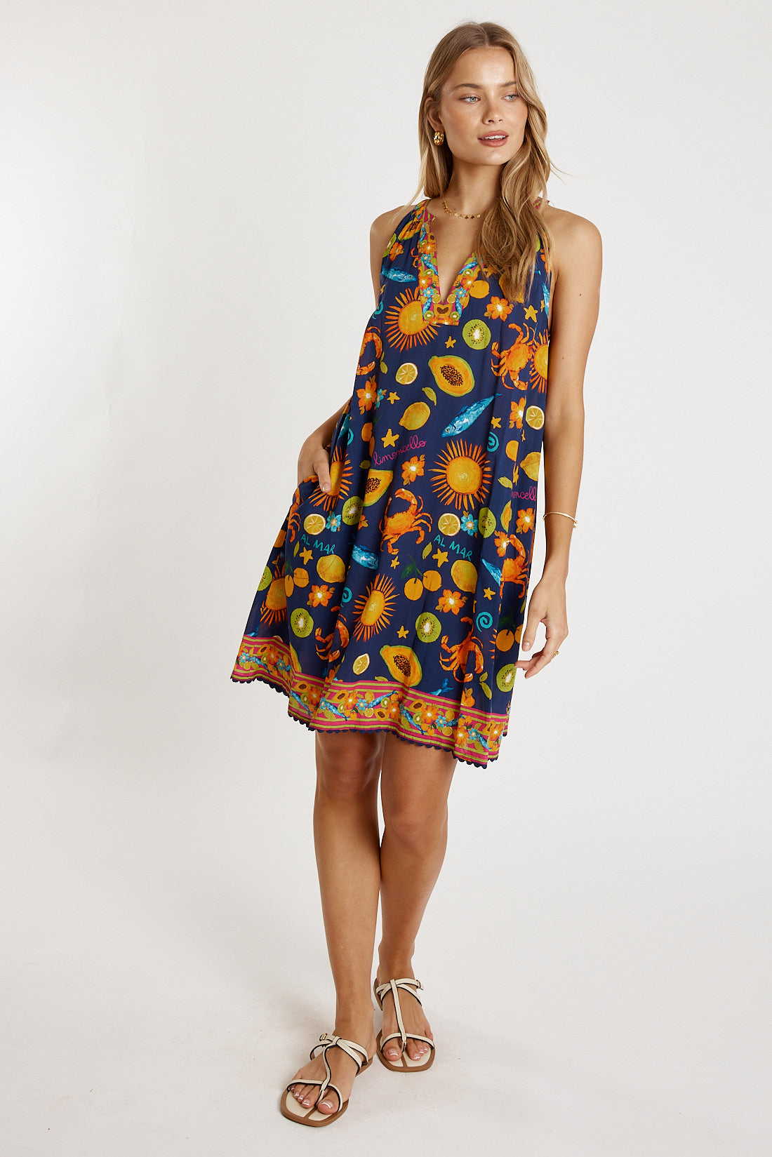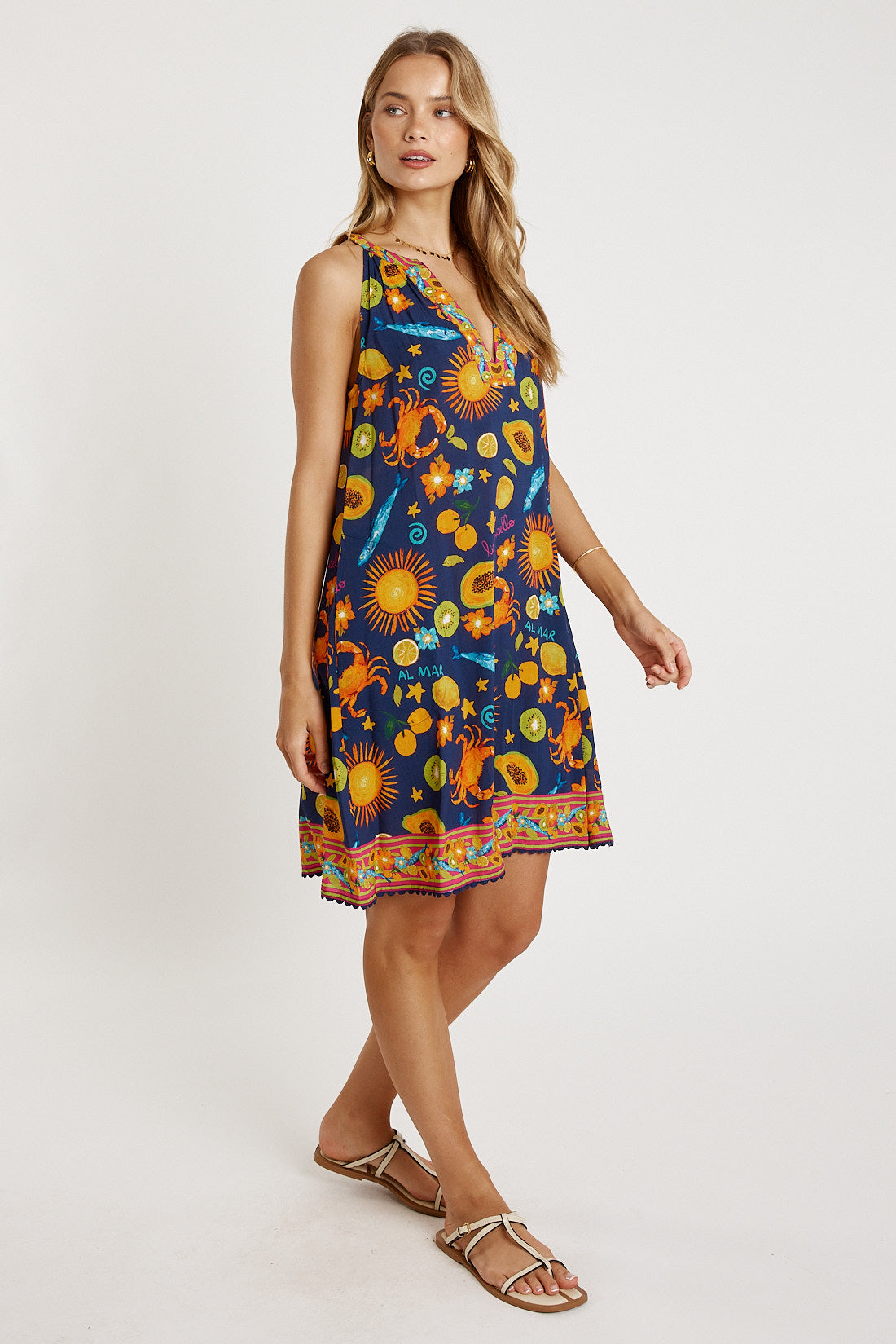 Easy and vibrant, the LulaLife Aliyah Sundress is the perfect warm-weather throw-on for relaxed days. Crafted from 100% viscose, it feels soft, lightweight, and breezy on the skin. The round neck with band and cut-away armholes give it a clean, modern look, while the relaxed A-line shape keeps it comfortable and flattering. Practical side pockets, a knee-length cut, and playful ricrac trim on the hem add personality to the design. Finished in an exclusive digital print and proudly designed in Australia, it’s a go-to sundress for weekends, holidays, and sunshine-filled outings.