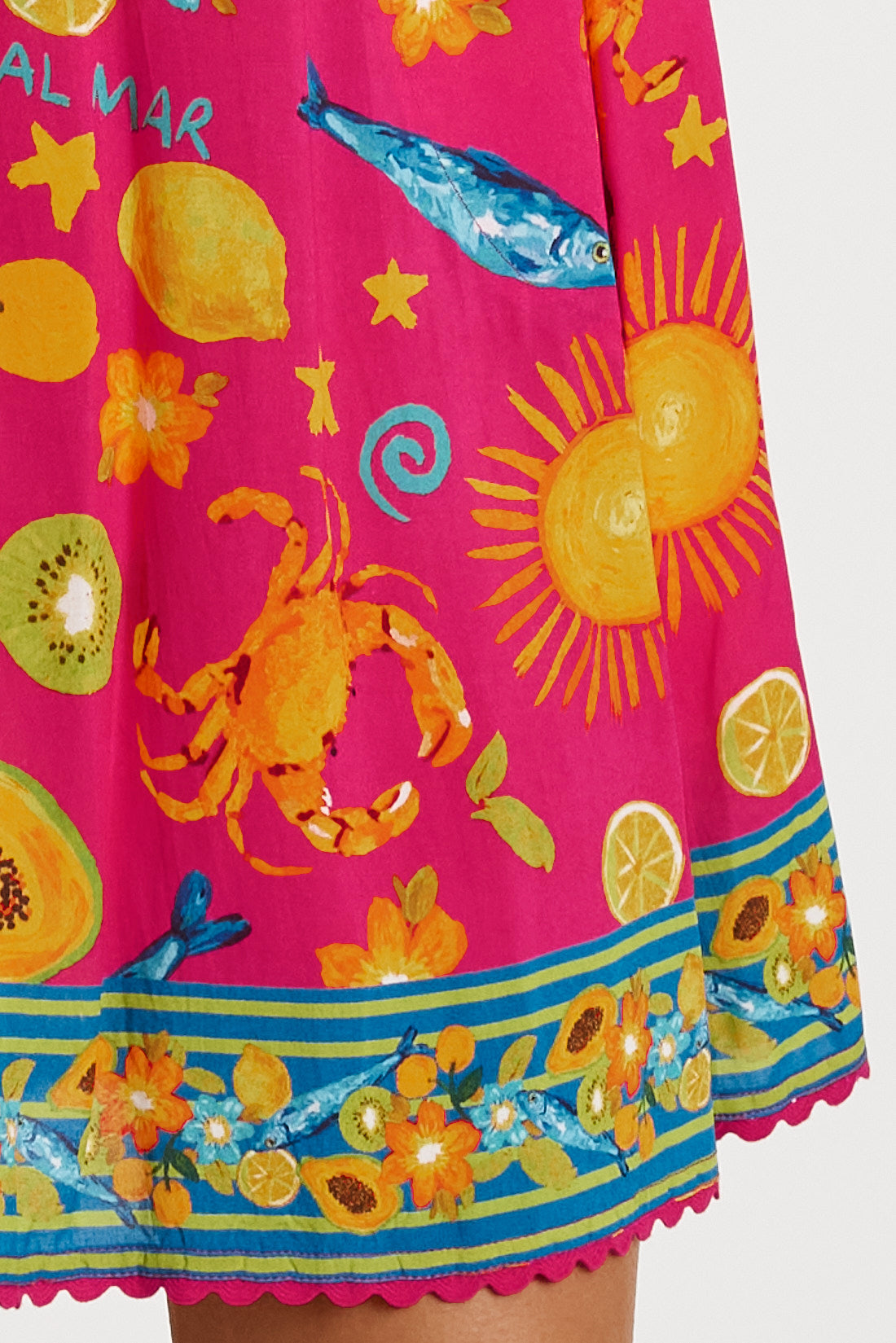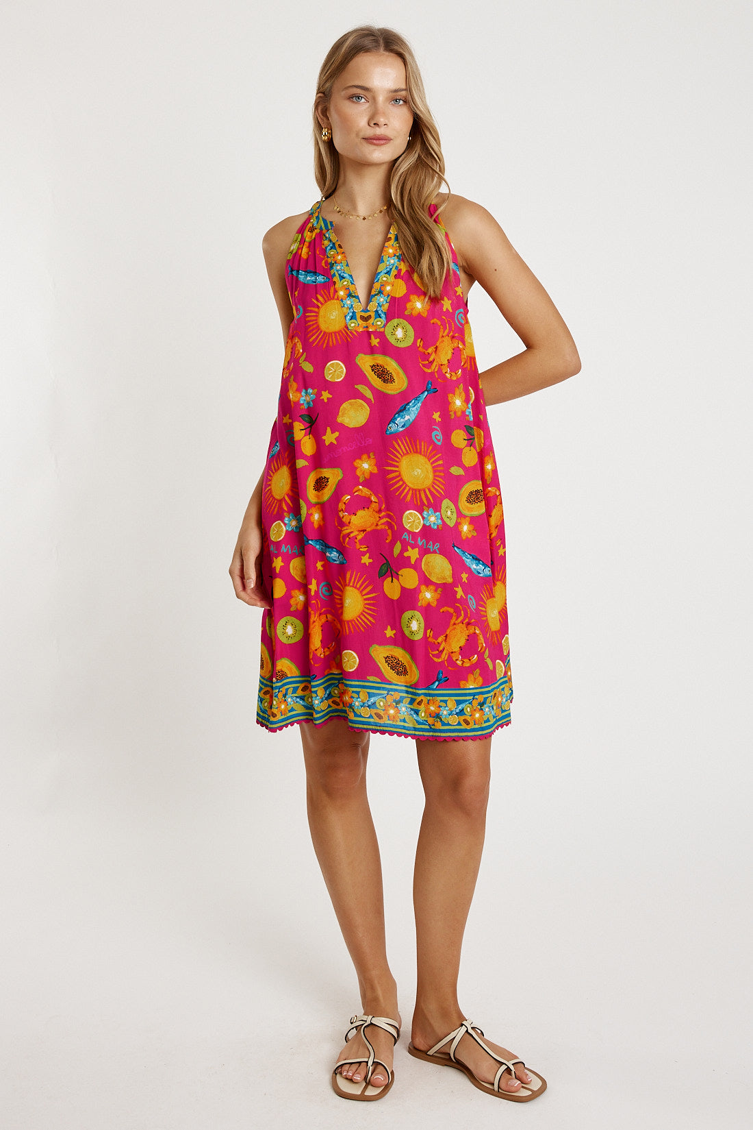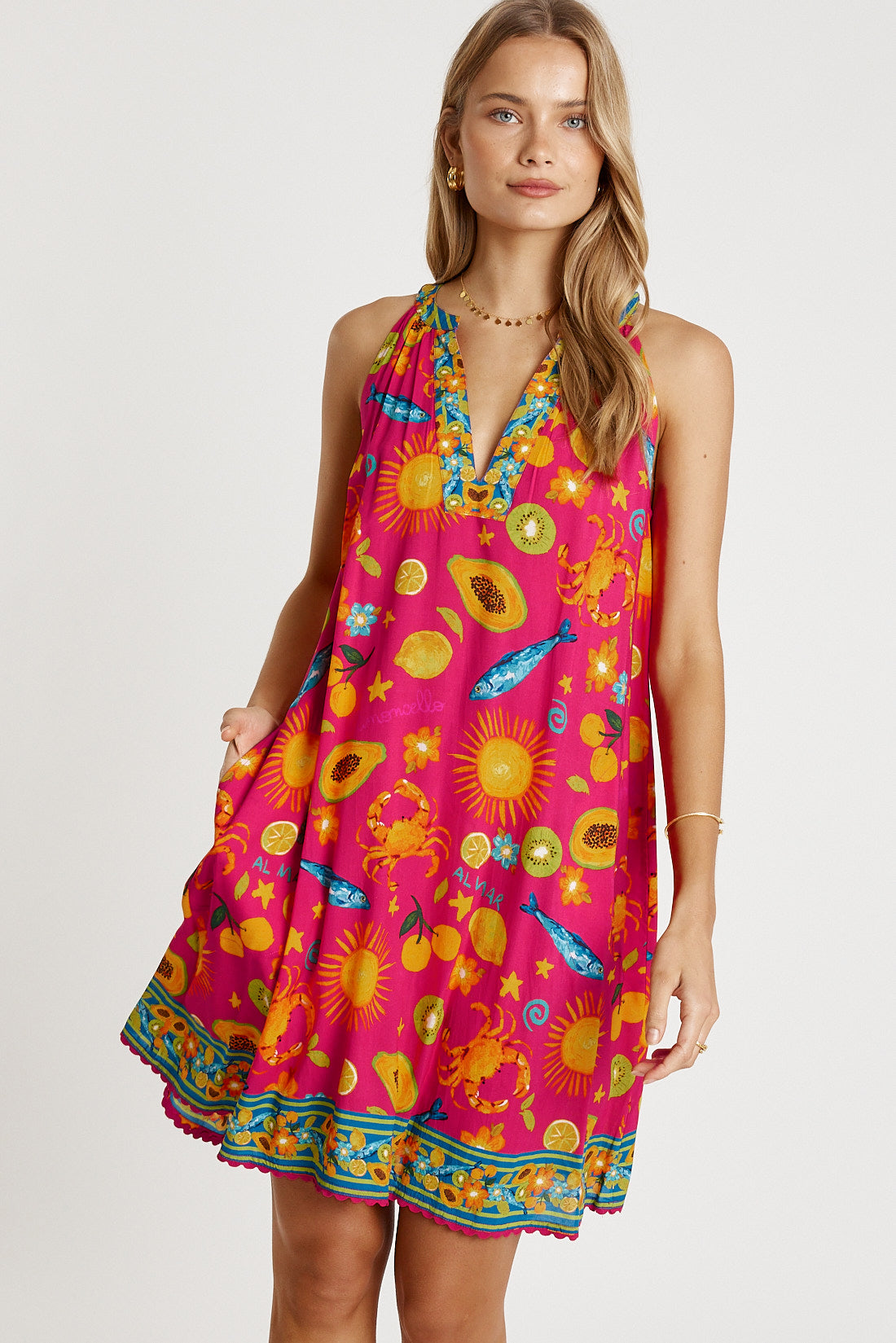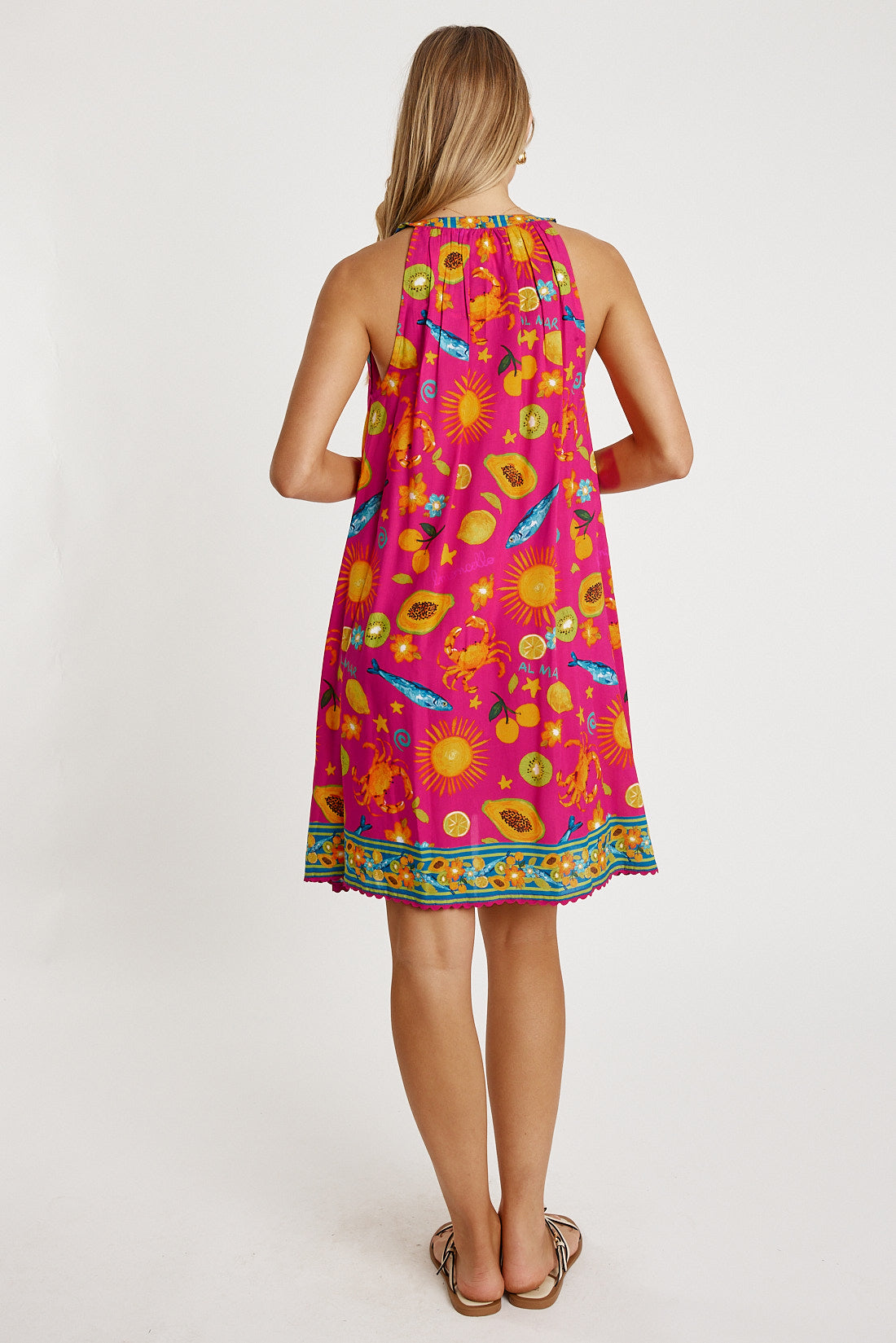 Easy and vibrant, the LulaLife Aliyah Sundress is the perfect warm-weather throw-on for relaxed days. Crafted from 100% viscose, it feels soft, lightweight, and breezy on the skin. The round neck with band and cut-away armholes give it a clean, modern look, while the relaxed A-line shape keeps it comfortable and flattering. Practical side pockets, a knee-length cut, and playful ricrac trim on the hem add personality to the design. Finished in an exclusive digital print and proudly designed in Australia, it’s a go-to sundress for weekends, holidays, and sunshine-filled outings.