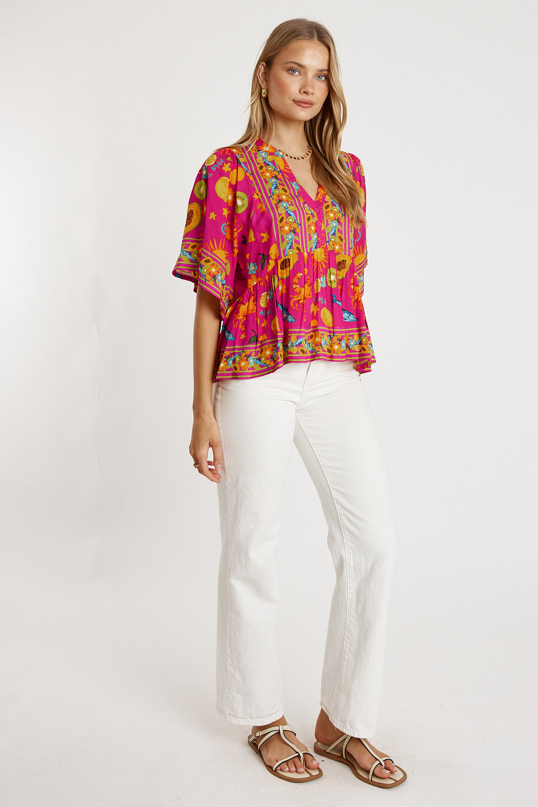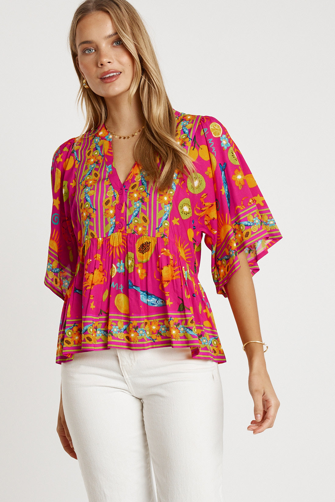 Perfect for relaxed days with a pop of colour, the LulaLife Aliyah Top blends comfort with effortless charm. Crafted from 100% viscose, it feels soft, breathable, and light on the skin. The Nauru collar, combined with a buttoned front tab, gives the top a clean, easy look, while the gentle gathers under the bodice add movement and shape. The wide elbow-length sleeves and playful ricrac trim bring a fun, feminine touch. Finished in an exclusive digital print and proudly designed in Australia, this top pairs beautifully with denim, linen, or the matching Aliyah Pant for a fresh daytime outfit.