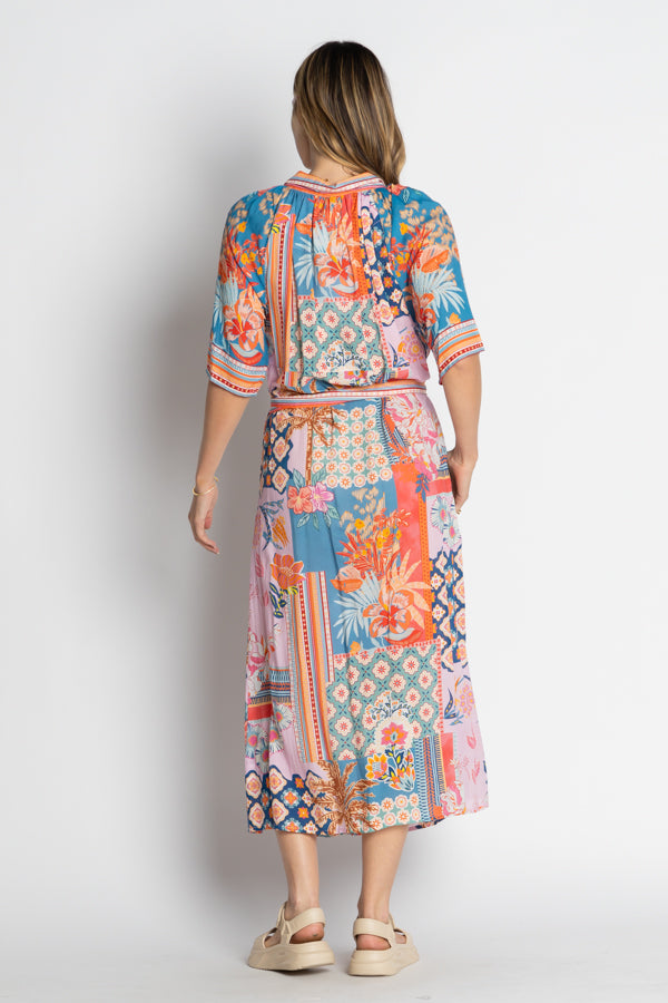 Carry your essentials in style with handy side pockets, and define your waist with the optional tie for a more tailored look. The vibrant digital patchwork print makes every outfit feel unique, and 100% viscose fabric ensures soft, breathable comfort all day long.