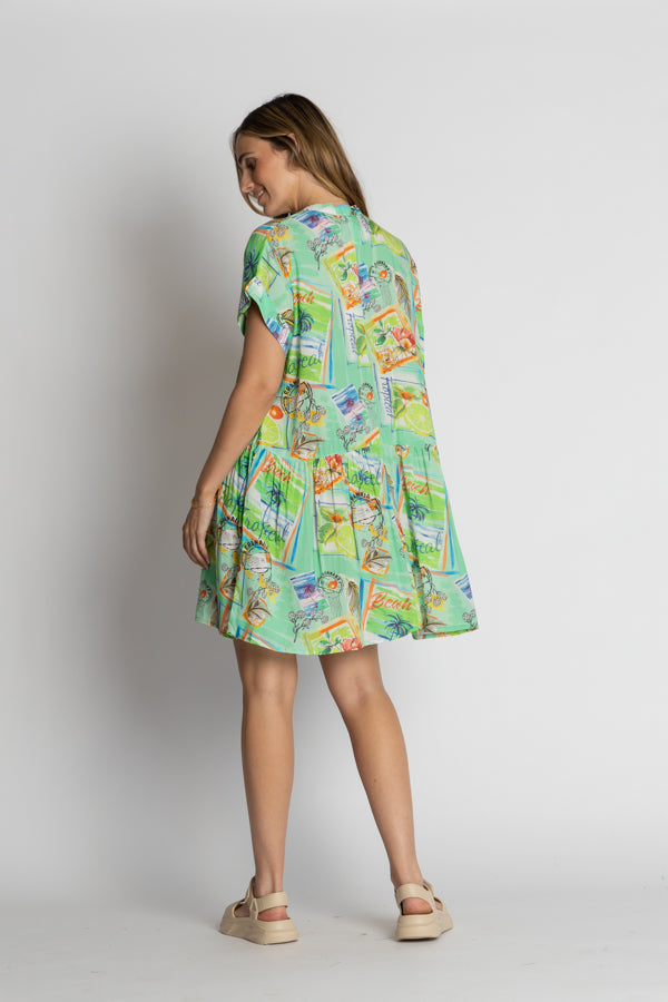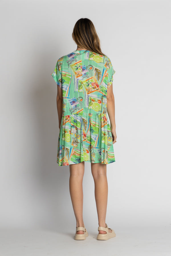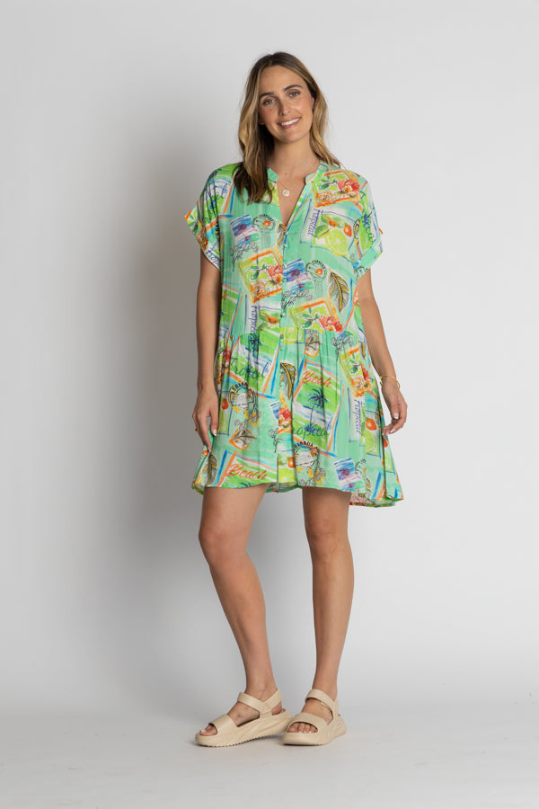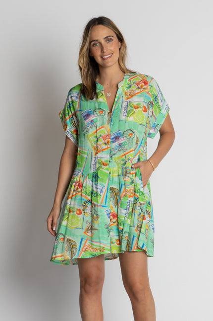 The digital print brings a pop of colour and personality, while thoughtful details like short sleeves, side pockets, and a full button-through front add both practicality and charm. Falling just above the knee, it’s perfect for effortless dressing — whether you're at the beach, the market, or out for brunch.