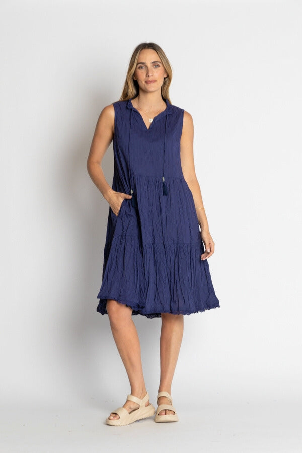 The V-neckline with adjustable ties adds a touch of laid-back charm, while the sleeveless design keeps you cool all day long. Whether you're strolling the markets, heading to brunch, or packing for a holiday getaway, this dress offers the perfect blend of easy elegance and lightweight comfort.