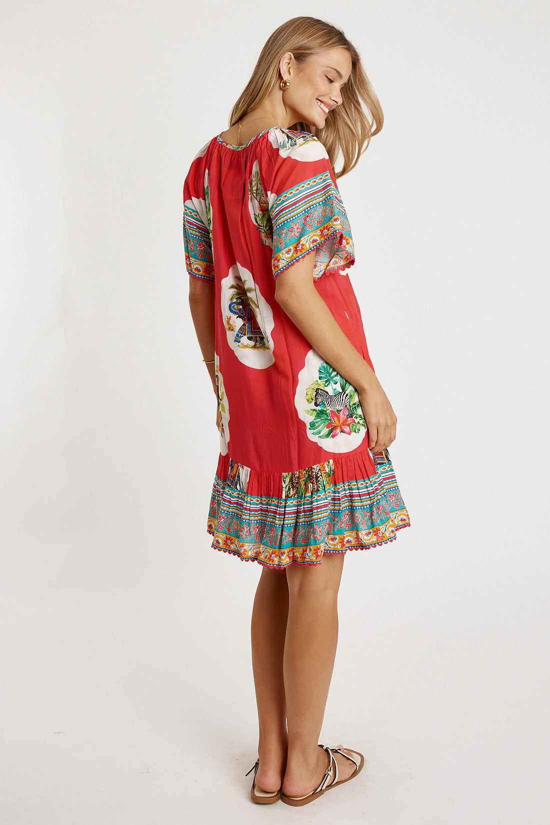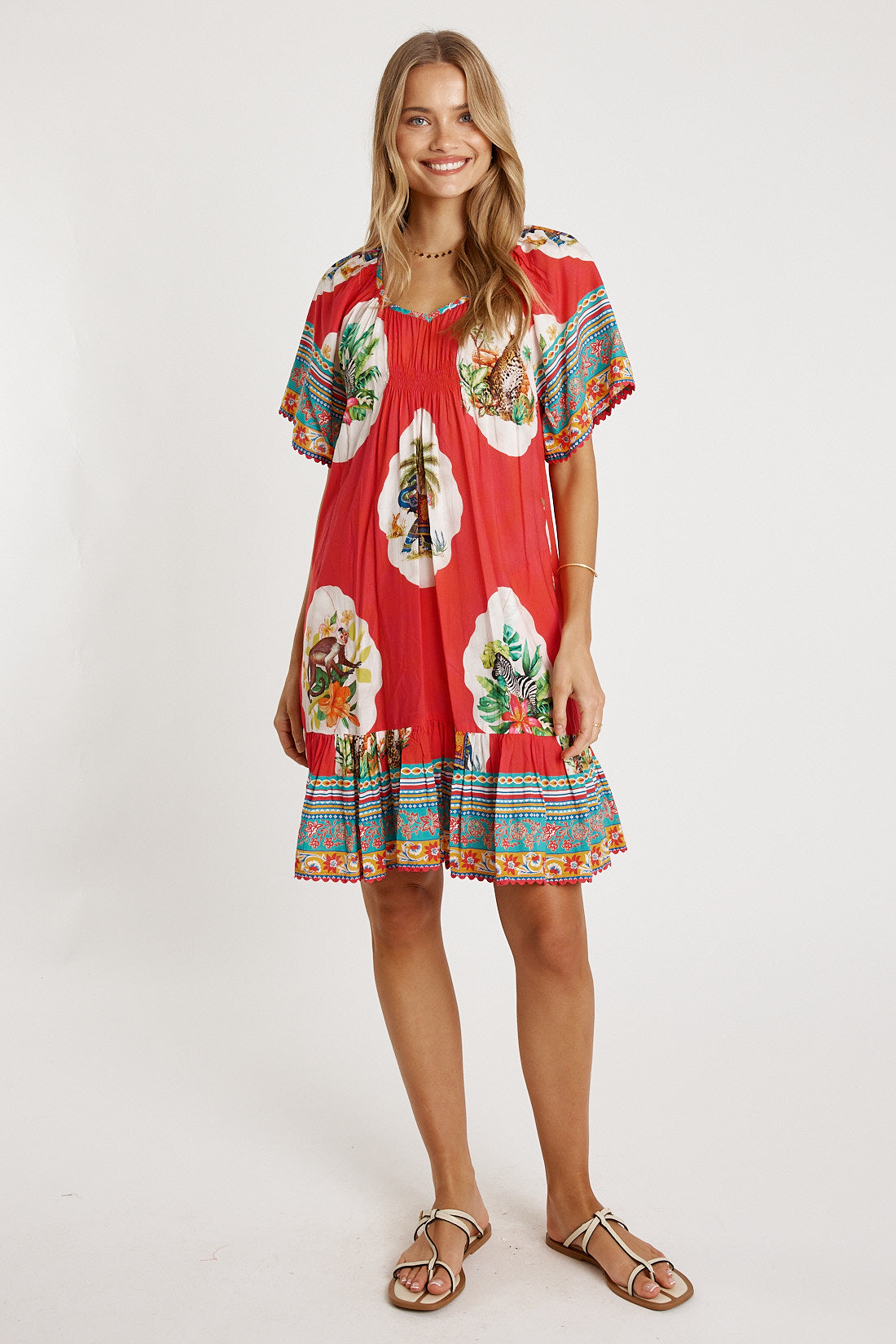 Effortlessly playful and easy to wear, the LulaLife Cyra Shirred Dress brings together comfort, movement, and unique detail. Made from 100% viscose, it feels soft, breathable, and perfect for warm days. The V-neck with gentle gathers creates a relaxed shape, while the shirring under the bust flatters without feeling tight. The wide raglan sleeves, paired with ricrac trim on the sleeves and hem, add a fun, feminine touch. Designed with an A-line shape and practical side pockets, this Australian-designed dress is ideal for weekend outings, holidays, or relaxed everyday wear.