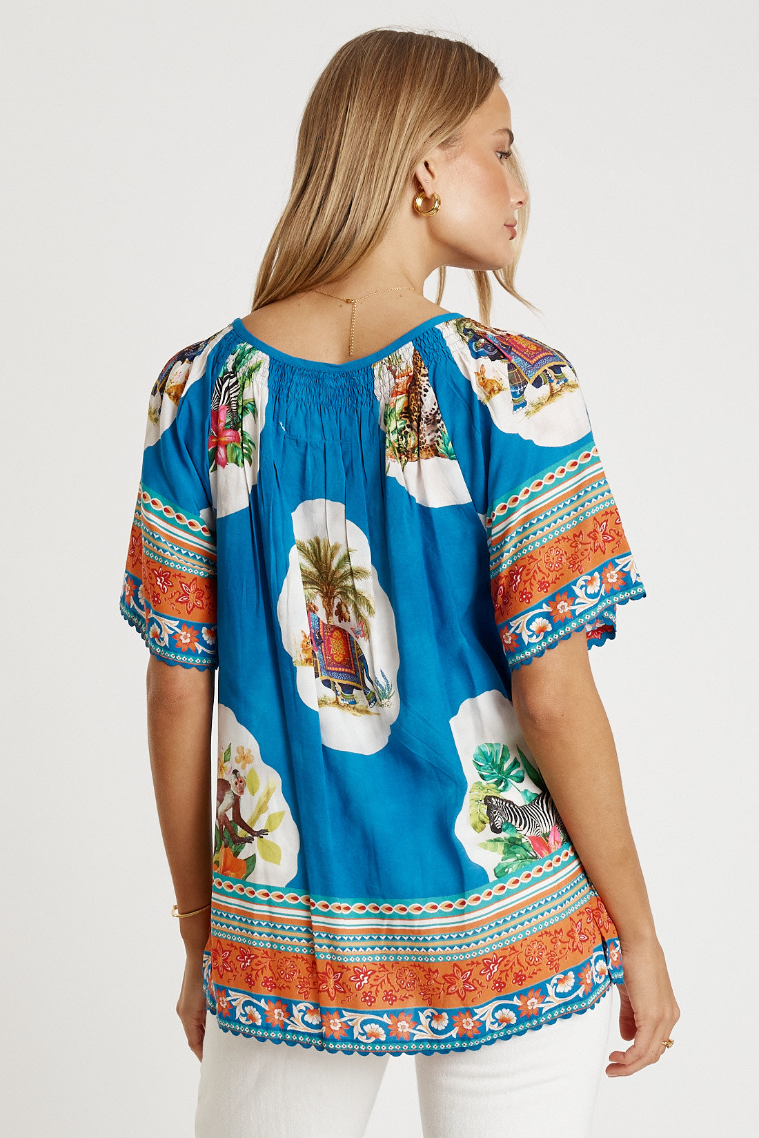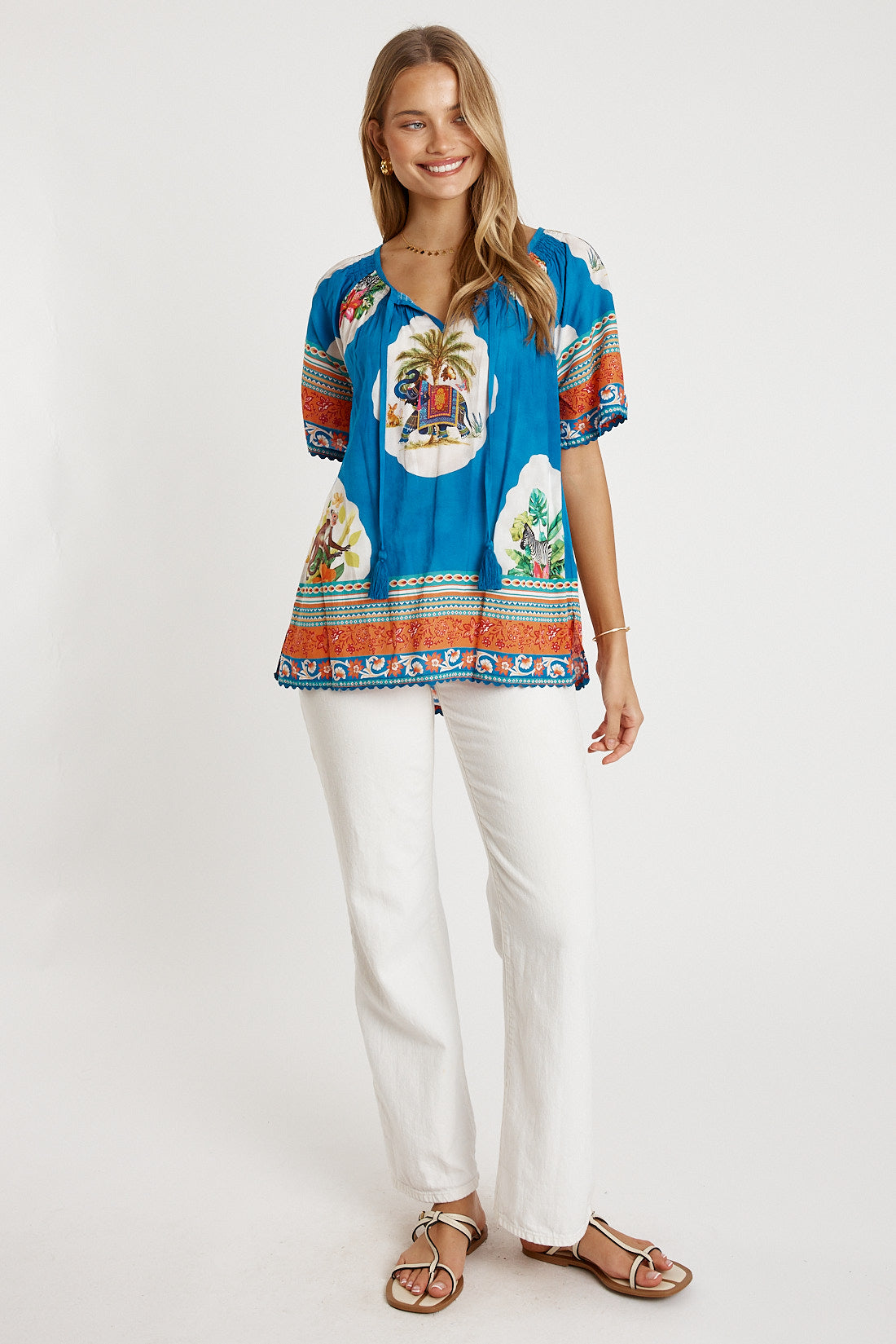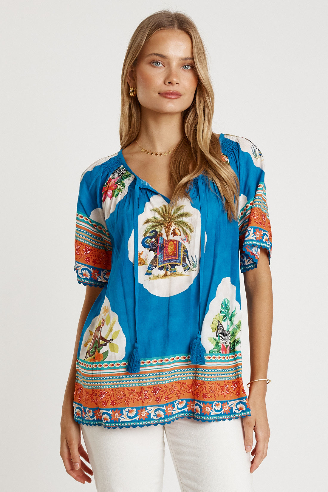 Designed for easy comfort with a fun, feminine twist, the LulaLife Cyra Top is perfect for warm, relaxed days. Made from 100% viscose, it feels soft, breathable, and lightweight on the skin. The gathered neckline with ties and tassels adds a playful touch, while the wide raglan sleeves keep the fit loose and airy. Ricrac trim on the sleeves and hem adds standout detail, and the side splits create effortless movement. Proudly designed in Australia, this top pairs beautifully with denim, linen pants, or the matching Cyra Pant for a bold everyday look.