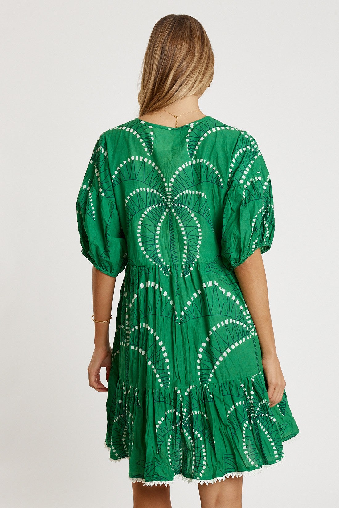 Fresh and easygoing, the LulaLife Idalia Dress is made for relaxed days with a soft, feminine touch. Crafted from 100% cotton, it feels light, breathable, and super comfortable to wear. The V neck and vertical bodice tucks add gentle shaping, while the gathered elbow-length sleeves with loose elastic keep the fit airy and effortless. With gathered tiers, handy side pockets, and a pretty braid trim on the hem, this Australian-designed dress blends comfort and charm in the best way. Perfect for weekends, beach days, or casual outings.