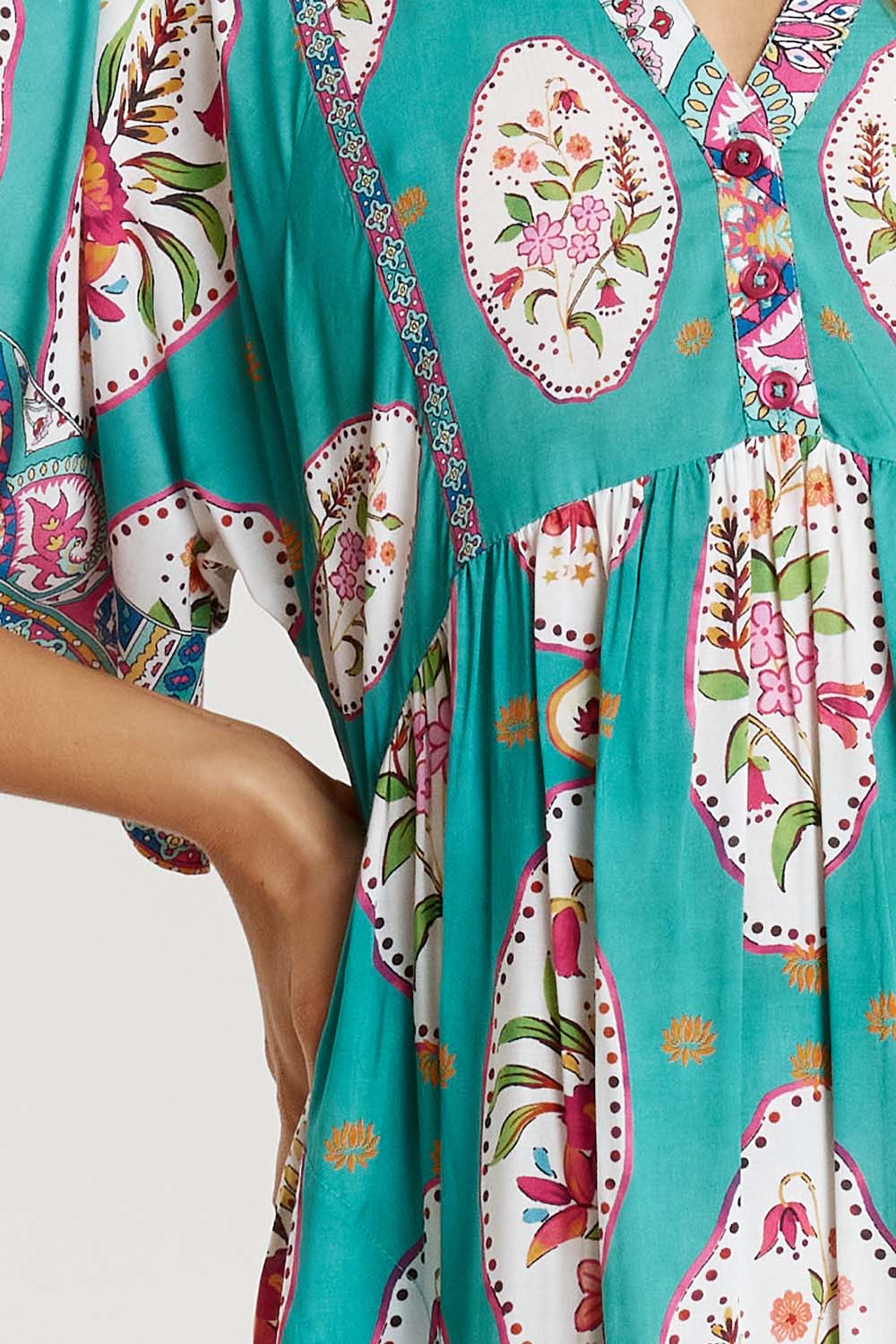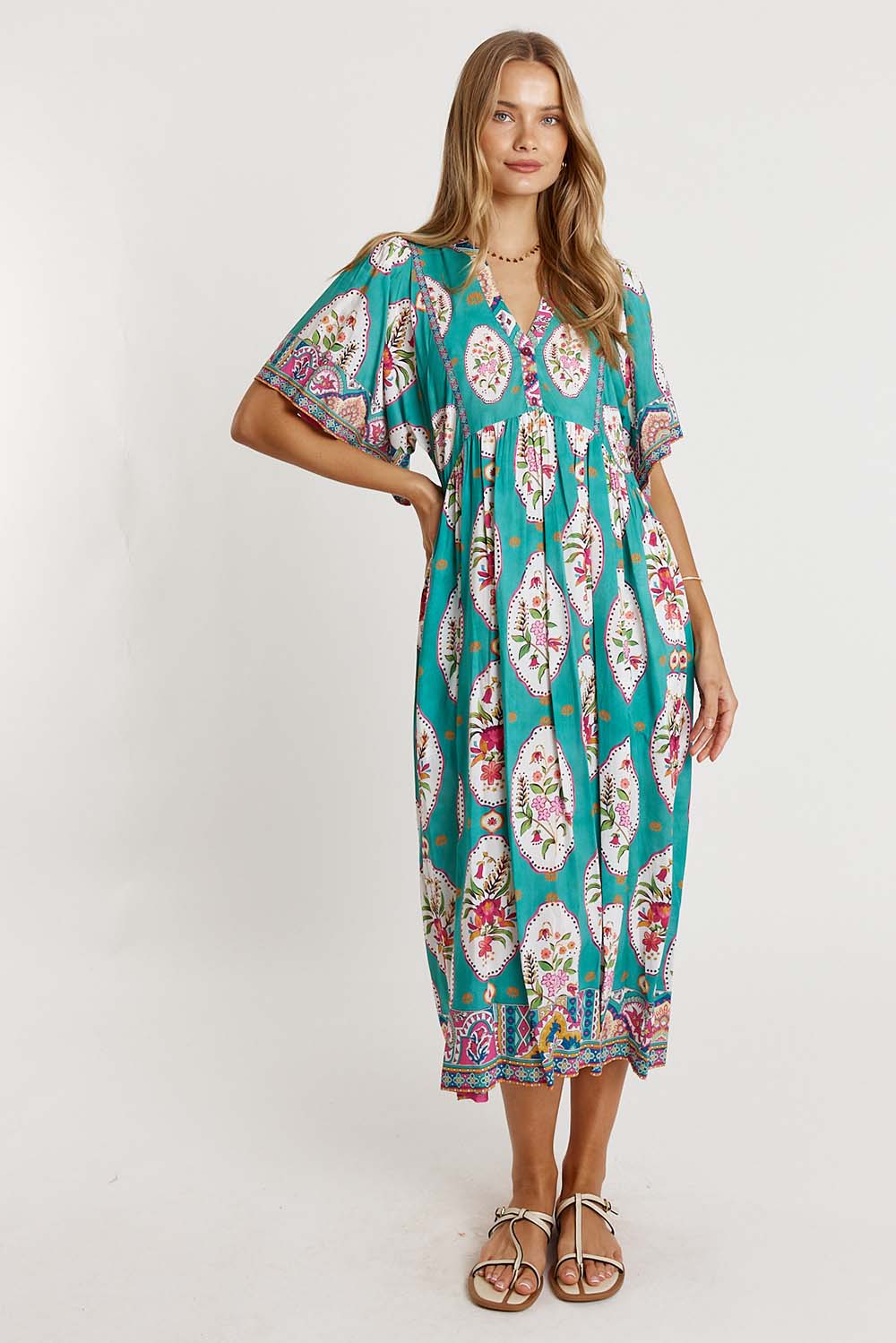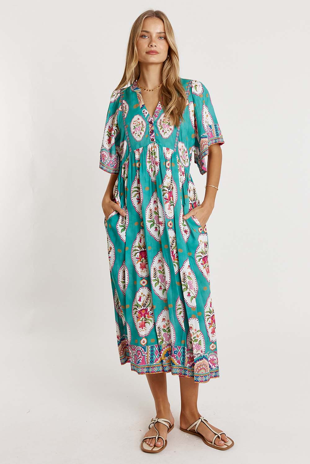 Bringing colour, comfort, and easy charm together, the LulaLife Imogen Midi is a relaxed everyday dress with a soft, floaty feel. Crafted from 100% viscose, it’s lightweight, breathable, and perfect for warm days. The Nauru collar and buttoned front tab give the bodice a clean, casual look, while the gentle gathers under the bodice add movement without bulk. The wide elbow-length sleeves and playful ricrac trim bring a fun, feminine touch. Practical side pockets and a vibrant digital print complete this Australian-designed midi—ideal for weekend wear, beach days, or easy summertime outings.