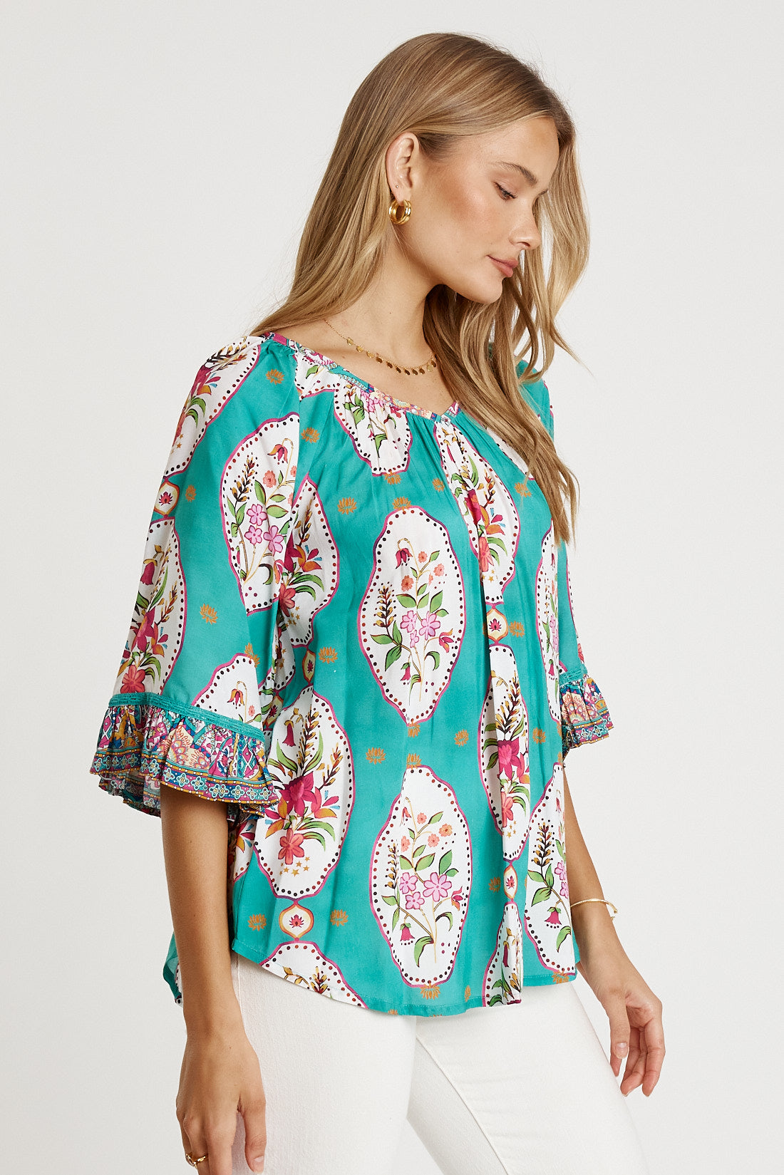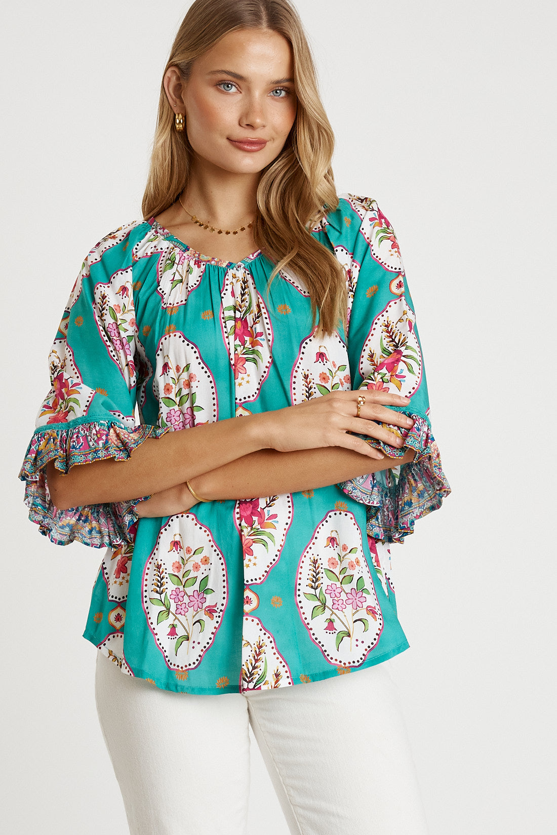 Adding colour and ease to your everyday wardrobe, the LulaLife Imogen Top is all about soft comfort and breezy style. Made from 100% viscose, it feels lightweight, breathable, and perfect for warm days. The V neck and gentle gathers from the neckline create a relaxed, flattering shape, while the wide raglan sleeves with a flounce hem bring soft movement. With a 3/4 length sleeve, a gently curved hem, and a vibrant digital print, this Australian-designed top pairs effortlessly with denim, linen, or relaxed pants for an easy, throw-on look.