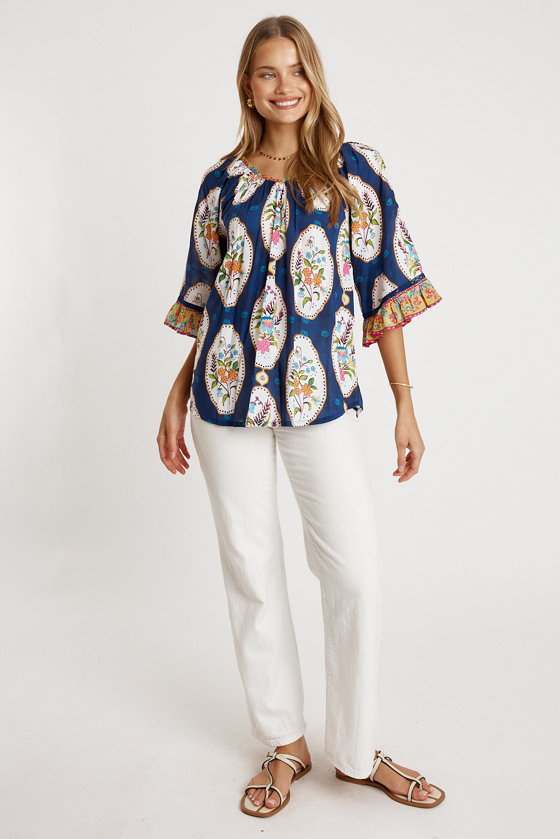 Adding colour and ease to your everyday wardrobe, the LulaLife Imogen Top is all about soft comfort and breezy style. Made from 100% viscose, it feels lightweight, breathable, and perfect for warm days. The V neck and gentle gathers from the neckline create a relaxed, flattering shape, while the wide raglan sleeves with a flounce hem bring soft movement. With a 3/4 length sleeve, a gently curved hem, and a vibrant digital print, this Australian-designed top pairs effortlessly with denim, linen, or relaxed pants for an easy, throw-on look.