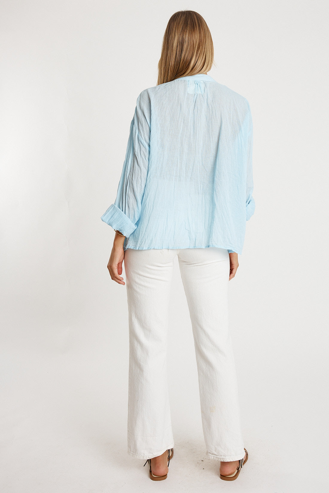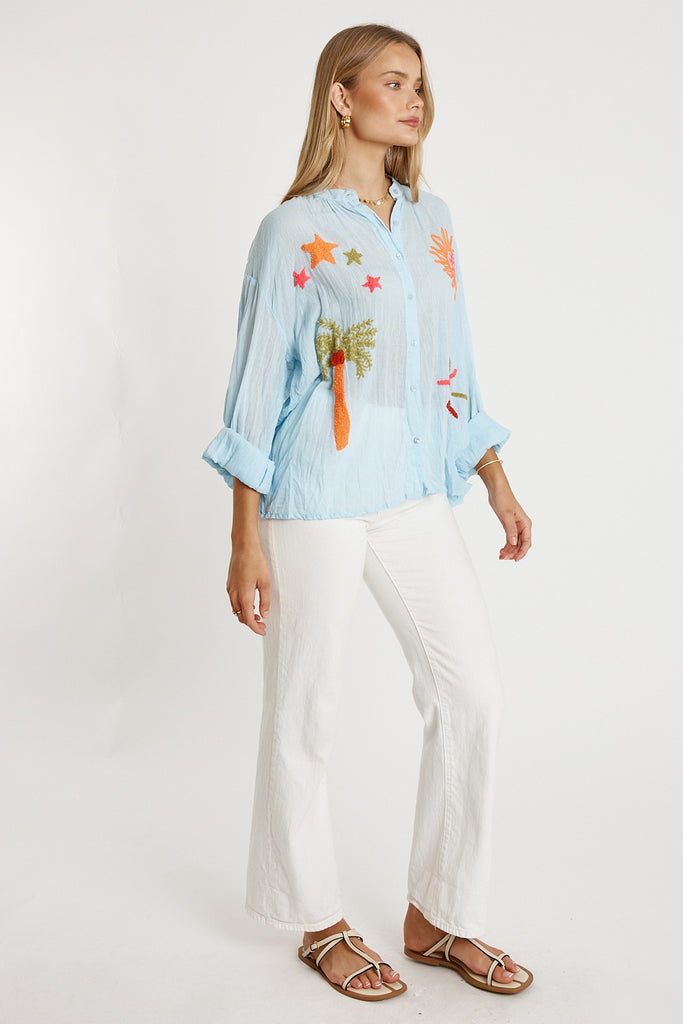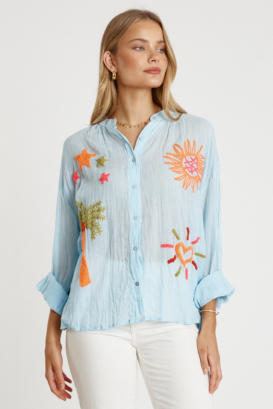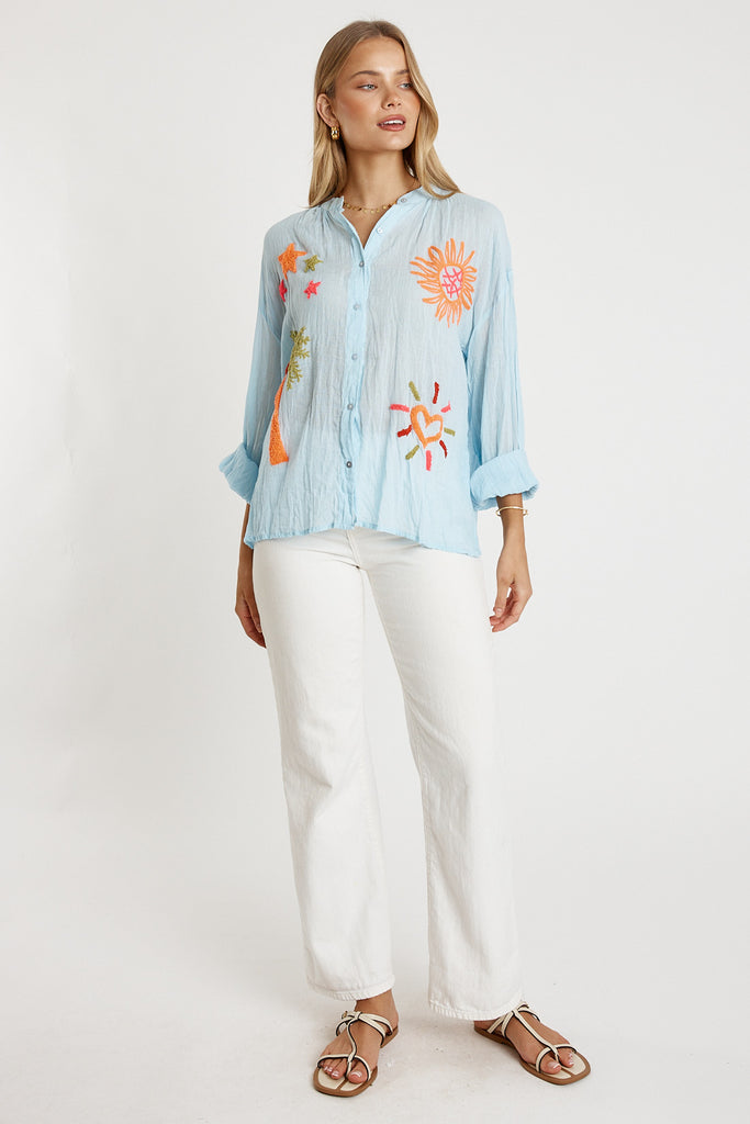 Light, pretty, and perfect for warm days, the LulaLife Keziah Shirt blends breezy comfort with delicate detail. Crafted from 100% cotton in a soft, sheer cotton gauze, it feels airy and effortless to wear. The Nauru collar and button-through front give it a clean, relaxed look, while the full-length sleeves with buttoned cuffs add versatility for styling rolled or worn long. Finished with embroidered summer motifs for a sweet, sunny touch, this Australian-designed shirt pairs beautifully with denim, linen pants, or shorts for an easy everyday outfit.