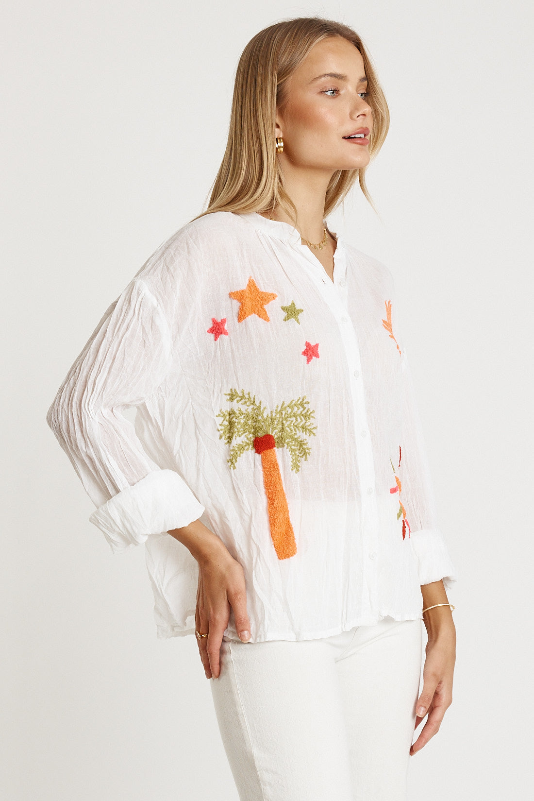 Light, pretty, and perfect for warm days, the LulaLife Keziah Shirt blends breezy comfort with delicate detail. Crafted from 100% cotton in a soft, sheer cotton gauze, it feels airy and effortless to wear. The Nauru collar and button-through front give it a clean, relaxed look, while the full-length sleeves with buttoned cuffs add versatility for styling rolled or worn long. Finished with embroidered summer motifs for a sweet, sunny touch, this Australian-designed shirt pairs beautifully with denim, linen pants, or shorts for an easy everyday outfit.