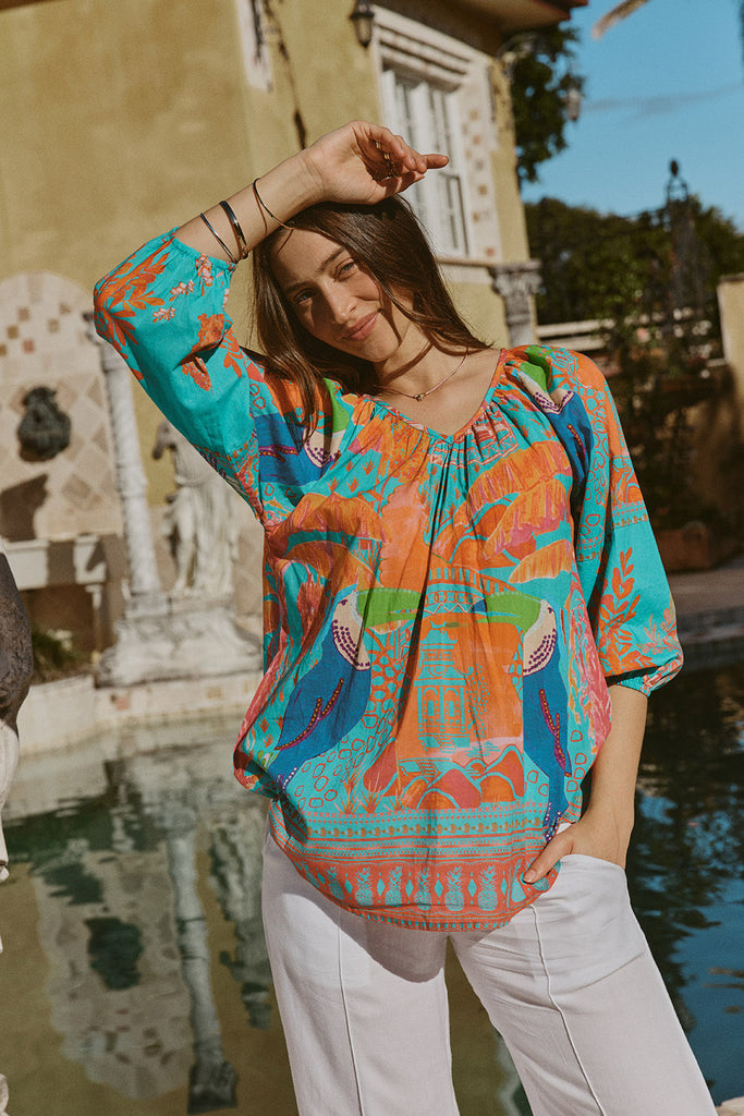 Brighten your wardrobe with the vibrant LulaLife Marquita Shirt, a statement piece designed for comfort and style. Crafted from 100% breathable cotton, this top showcases a stunning tropical digital print that captures the carefree spirit of summer. The V-neckline flatters your silhouette, while the wide raglan sleeves with elastic hems add a relaxed, feminine touch. Featuring 3/4 length sleeves and side splits for easy movement, it’s the perfect balance of laid-back charm and polished appeal.