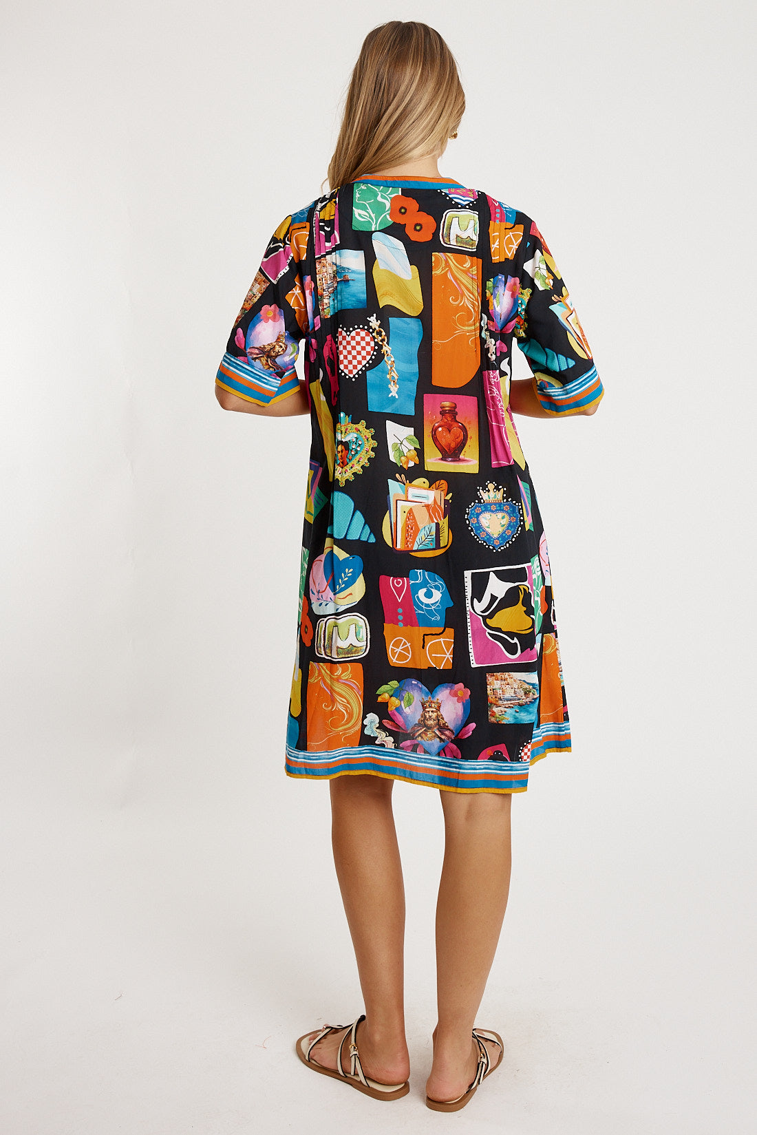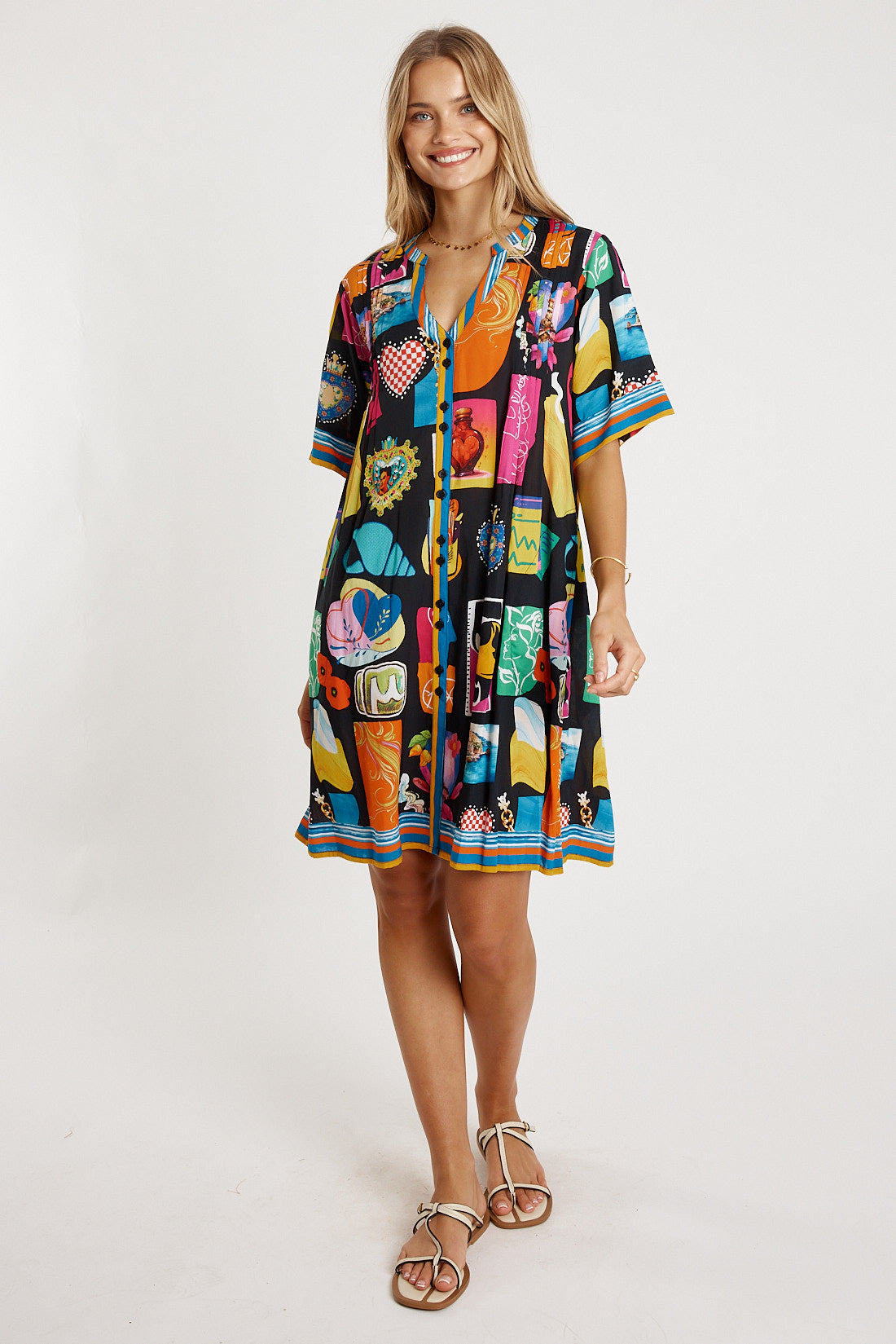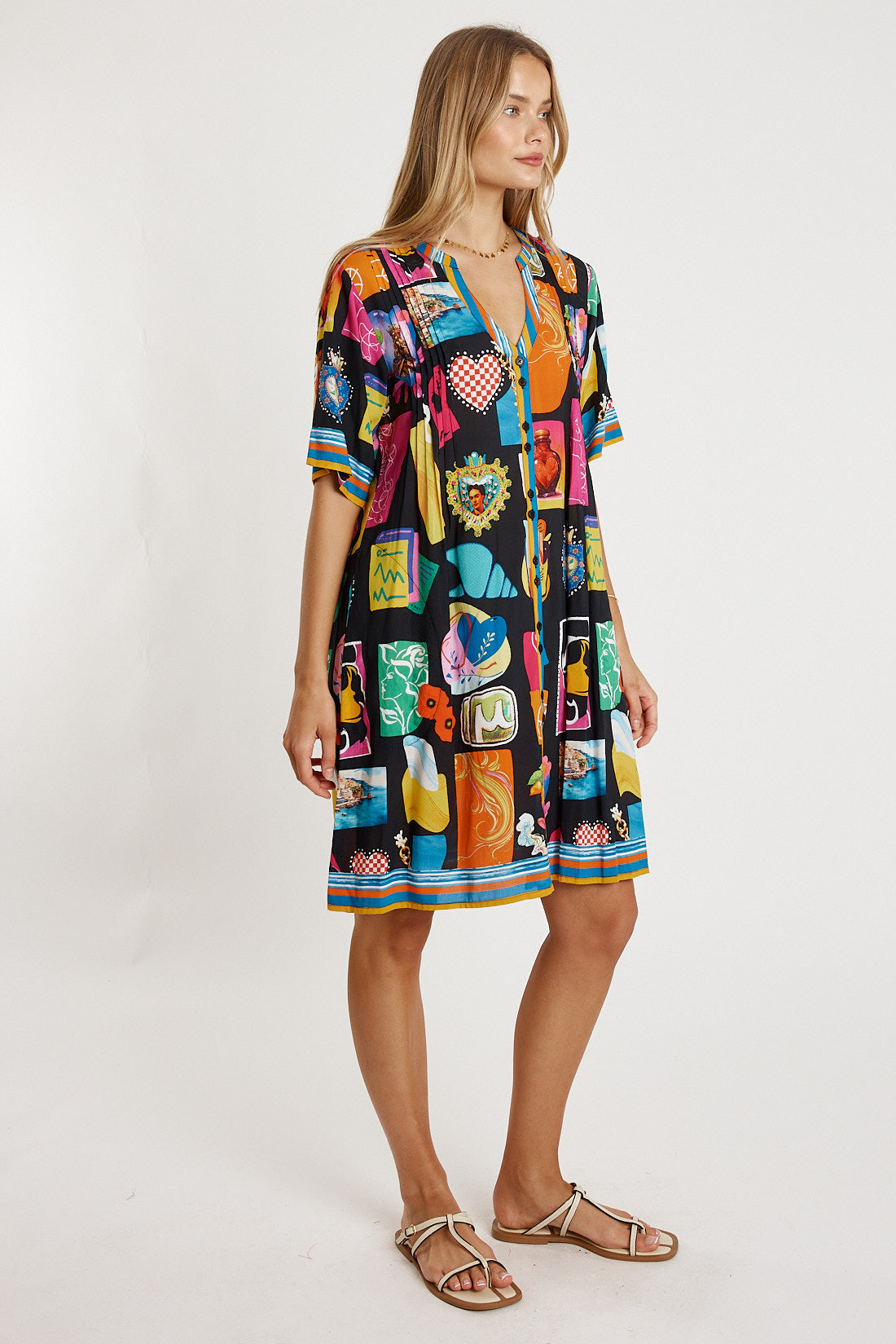 Fresh, flowy, and full of personality, the LulaLife Odette Tuck Dress is an easy everyday favourite with beautiful detail. Made from 100% viscose, it feels soft, lightweight, and perfect for warm days. The Nauru collar flowing into a V-neck and front tab button-through design give it a relaxed, polished look. Soft vertical tucks on the front and back bodice add gentle shaping, while the elbow-length sleeves, side pockets, and curved hem keep the fit effortless and comfortable. Finished in a striking Japanese-inspired digital print, this Australian-designed dress—made in India—offers vibrant, wearable style. Model is 5'8½” for reference.