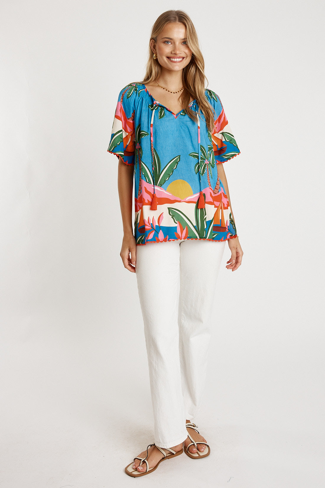 Fresh, floaty, and full of personality, the LulaLife Pacifica Top is made for easy warm-weather dressing. Crafted from 100% viscose, it feels soft, breathable, and lightweight on the skin. The gathered neckline with ties and tassels adds a playful, feminine touch, while the wide raglan sleeves keep the fit relaxed and breezy. Finished with ricrac trim on the sleeves and hem and side splits for extra movement, this Australian-designed top pairs beautifully with denim, linen pants, or the matching Pacifica Pant for a bold, effortless look.