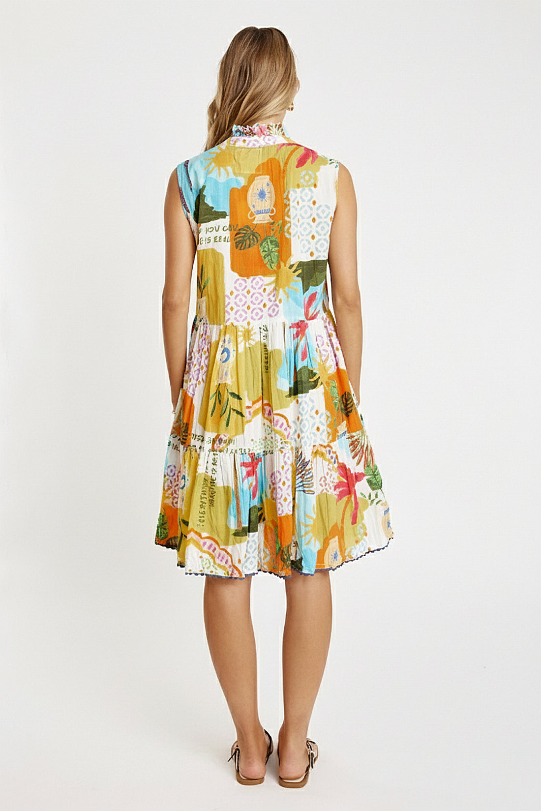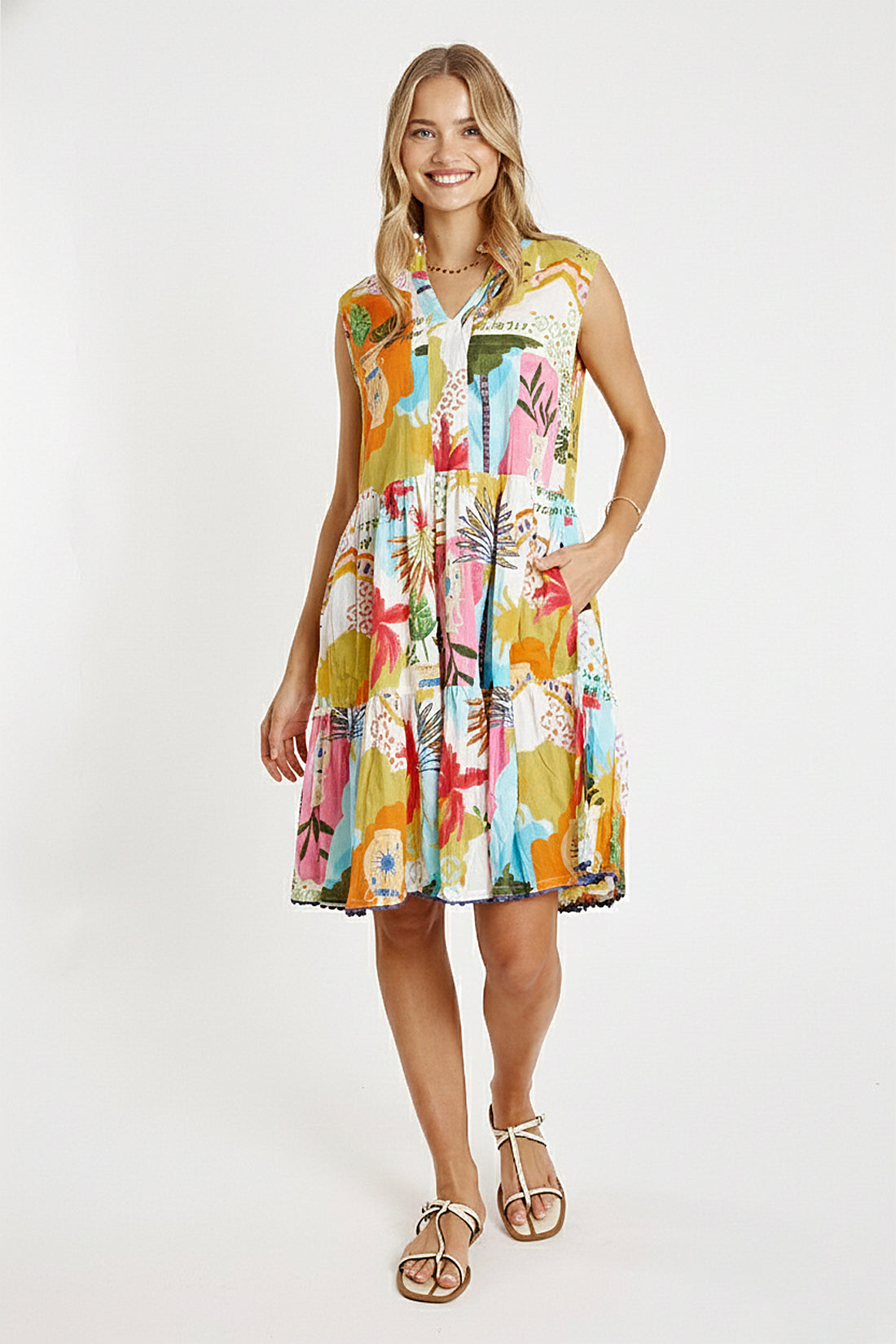 Brightening your warm-weather wardrobe, the LulaLife Rayna S/L Dress delivers easy comfort with a fun, feminine twist. Made from 100% cotton, it feels soft, breathable, and perfect for summer days. The neckband with frill trim adds a pretty detail to the V-neck, while the sleeveless design keeps it cool and effortless. The tiered gathered skirt brings soft movement, and practical side pockets make it an easy everyday choice. Finished at a flattering knee length with playful ric-rac braid trim on the hem, this Australian-designed dress blends colour, comfort, and casual charm with ease.