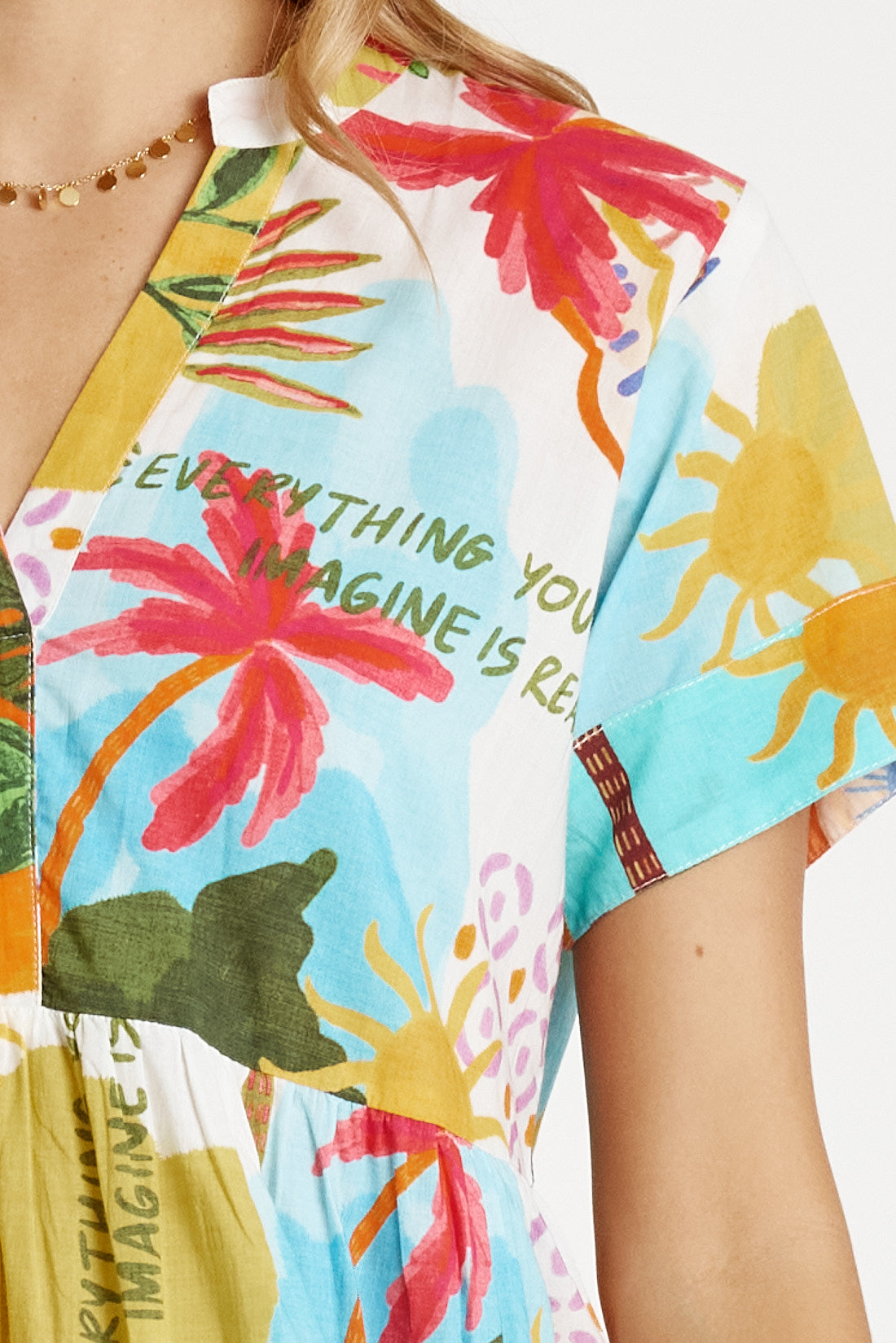 Soft, breezy, and effortlessly bright, the LulaLife Rayna Midi brings together comfort and tropical flair. Made from 100% cotton, it feels lightweight, breathable, and perfect for warm-weather days. The Nauru collar and front tab add easy detail to the bodice, while the gentle gathers from the under-bust seam create relaxed movement. Finished with short sleeves, practical side pockets, and a flattering mid-calf length, it’s polished off with playful ric-rac braid trim on the hem. Styled in a vibrant tropical-inspired digital print and proudly designed in Australia, this midi dress is ideal for holidays, weekends, or everyday sunshine.