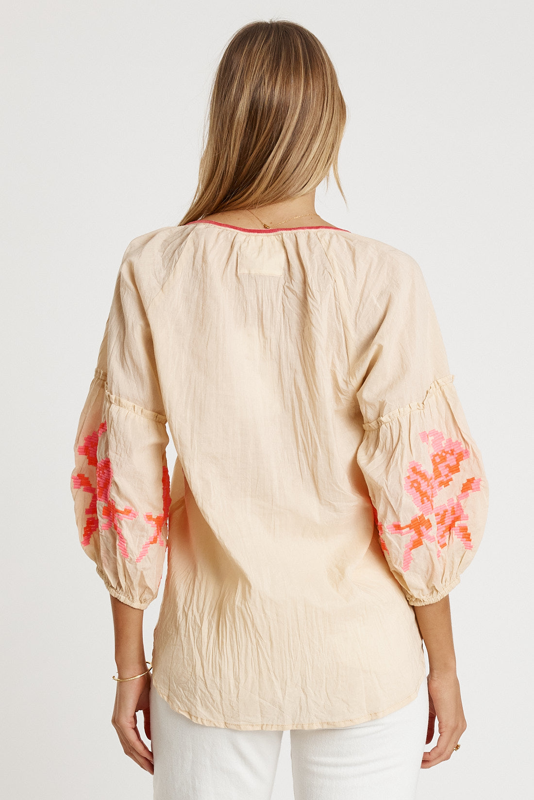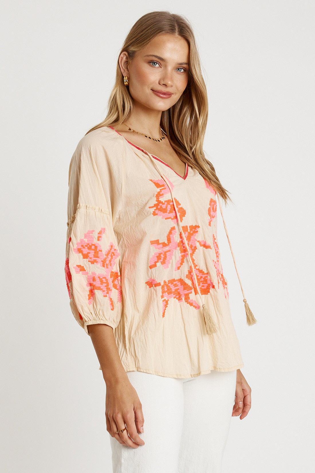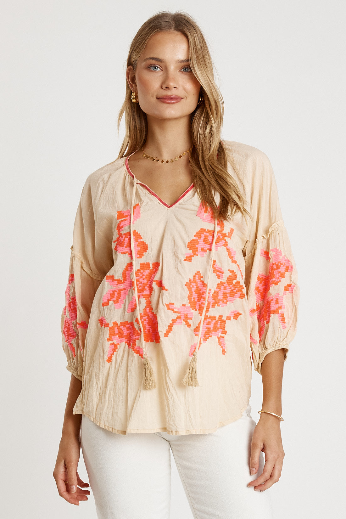 Bringing soft texture and easy charm, the LulaLife Rosalind Top is a breezy embroidered favourite for warm days. Made from 100% cotton, it feels light, breathable, and super comfortable. The scooped neck with ties and a front split adds a relaxed, feminine touch, while the gentle gathers from the neckline create soft flow. The raglan sleeves with elastic hems keep the fit airy, and the 3/4 length sleeves add everyday ease. Finished with side splits and delicate embroidery, this Australian-designed top pairs beautifully with denim, shorts, or cotton pants for effortless daytime style.