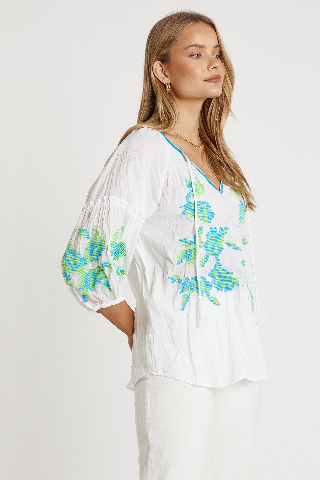 Bringing soft texture and easy charm, the LulaLife Rosalind Top is a breezy embroidered favourite for warm days. Made from 100% cotton, it feels light, breathable, and super comfortable. The scooped neck with ties and a front split adds a relaxed, feminine touch, while the gentle gathers from the neckline create soft flow. The raglan sleeves with elastic hems keep the fit airy, and the 3/4 length sleeves add everyday ease. Finished with side splits and delicate embroidery, this Australian-designed top pairs beautifully with denim, shorts, or cotton pants for effortless daytime style.