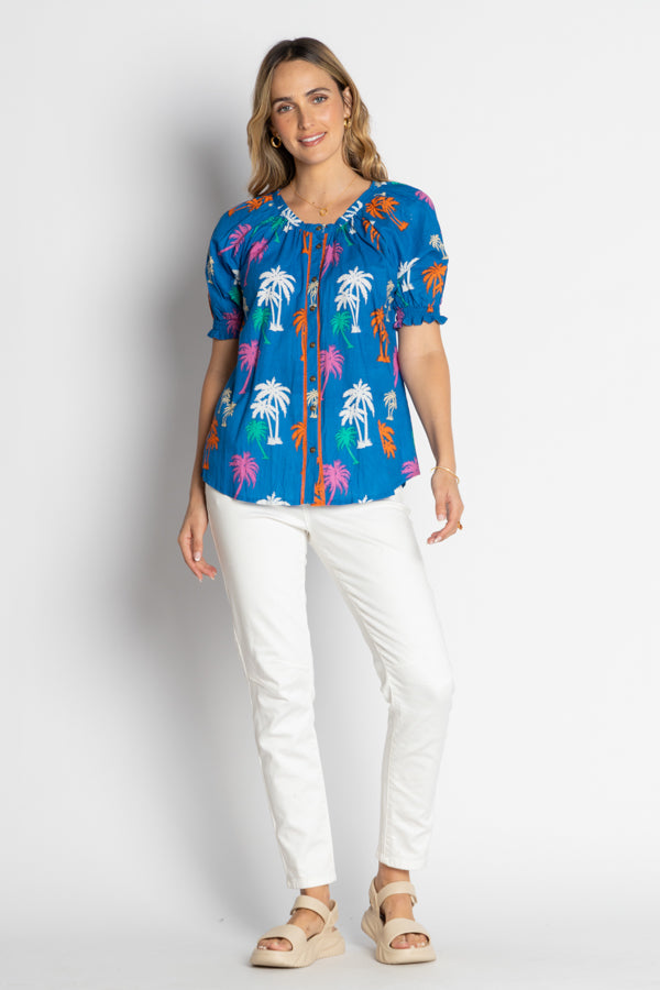 Effortlessly chic, the LulaLife Shamira Top captures that carefree coastal vibe you’ll love. Crafted from breathable 100% cotton, this relaxed-fit peasant blouse features a round neckline with playful ties and tassels, gentle gathers for flowy movement, and raglan sleeves finished with soft elastic hems. The button-through front and curved hemline create a flattering silhouette that works beautifully with jeans, shorts, or linen pants. Designed in Australia, the vibrant tropical beach print brings sunshine to every outfit — perfect for warm days and easy weekends.