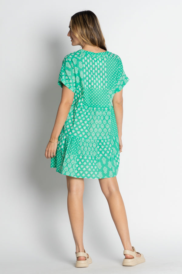 Functional and stylish, the short cuffed sleeves and gathered tiers create movement and practicality, making it ideal for casual outings or relaxed weekend vibes. The versatile design allows for easy styling—pair with sandals for a daytime look or sneakers for a chic, on-the-go outfit.
