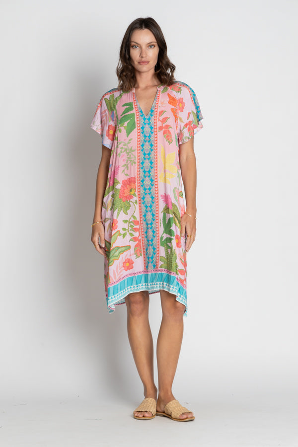 A V-neckline with a Nauru collar adds a chic twist, while the loose raglan sleeves fall gracefully to the elbows for an airy, feminine feel. The digital scarf placement print makes every piece unique—an artful blend of colour and pattern that captures the spirit of summer.