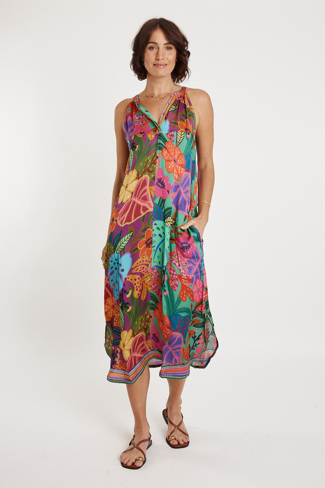 A relaxed fit and flattering A-line silhouette make this maxi easy to wear and universally flattering, while the clean V-neckline adds a modern, feminine touch. Thoughtful details set it apart, including functional side pockets and curved side splits for extra movement and comfort. Finished with matte gold micro-piping inserts, this Australian-designed piece delivers a refined, elevated look without losing its laid-back appeal.