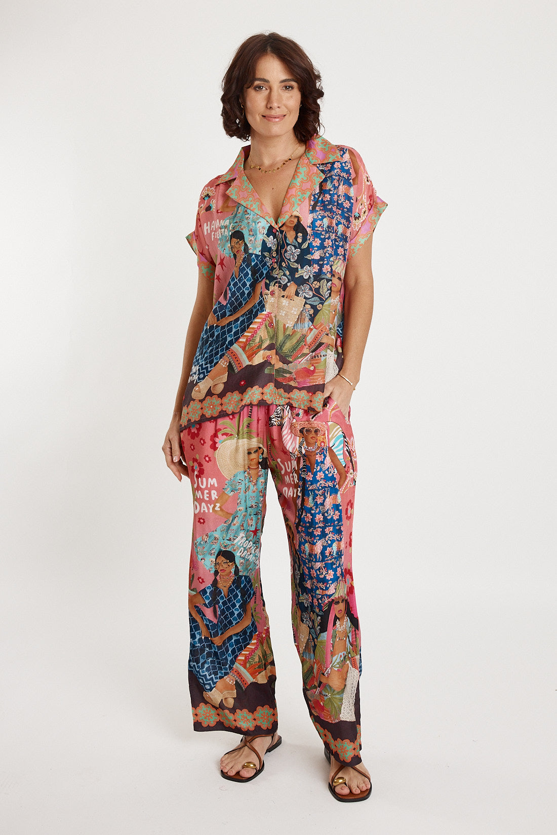 Bright, fun, and effortlessly polished, the LulaSoul Fiesta Shirt is designed to bring colour and ease to your everyday wardrobe. Crafted from smooth 100% satin modal, it drapes softly with a silky, lightweight feel. The relaxed fit, lapelled collar, and full button-through front keep the look clean and versatile, while the short sleeves with cuffs add a modern, tailored touch. Finished with an exclusive digital print and Australian-designed flair, this shirt pairs perfectly with denim, linen, or the matching Fiesta Pant for a bold, standout set.
