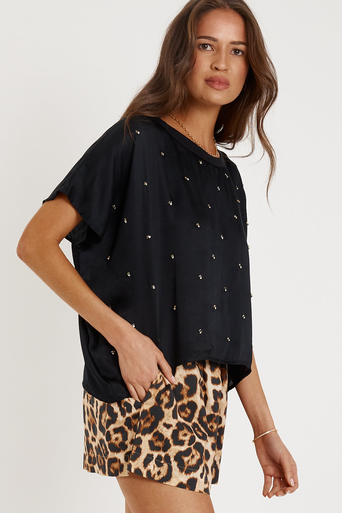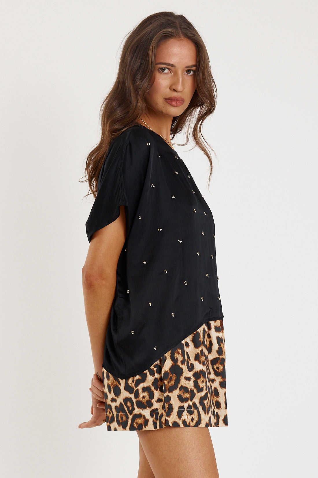 Slip into pure comfort with this oversized tee that's all about that effortless vibe. Crafted from 100% viscose satin, it drapes beautifully and feels like a dream against your skin. The relaxed fit pairs perfectly with the ribbed neckline for a polished-casual look, while short sleeves keep things breezy. Whether you're lounging at home or stepping out in style, this royal beauty is your new go-to for laid-back luxury.