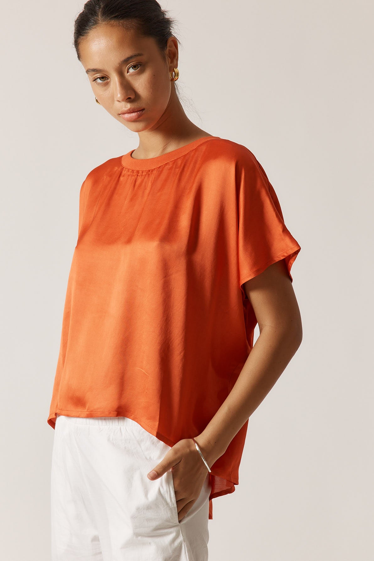 Slip into pure comfort with this oversized tee that's all about that effortless vibe. Crafted from 100% viscose satin, it drapes beautifully and feels like a dream against your skin. The relaxed fit pairs perfectly with the ribbed neckline for a polished-casual look, while short sleeves keep things breezy. Whether you're lounging at home or stepping out in style, this royal beauty is your new go-to for laid-back luxury.