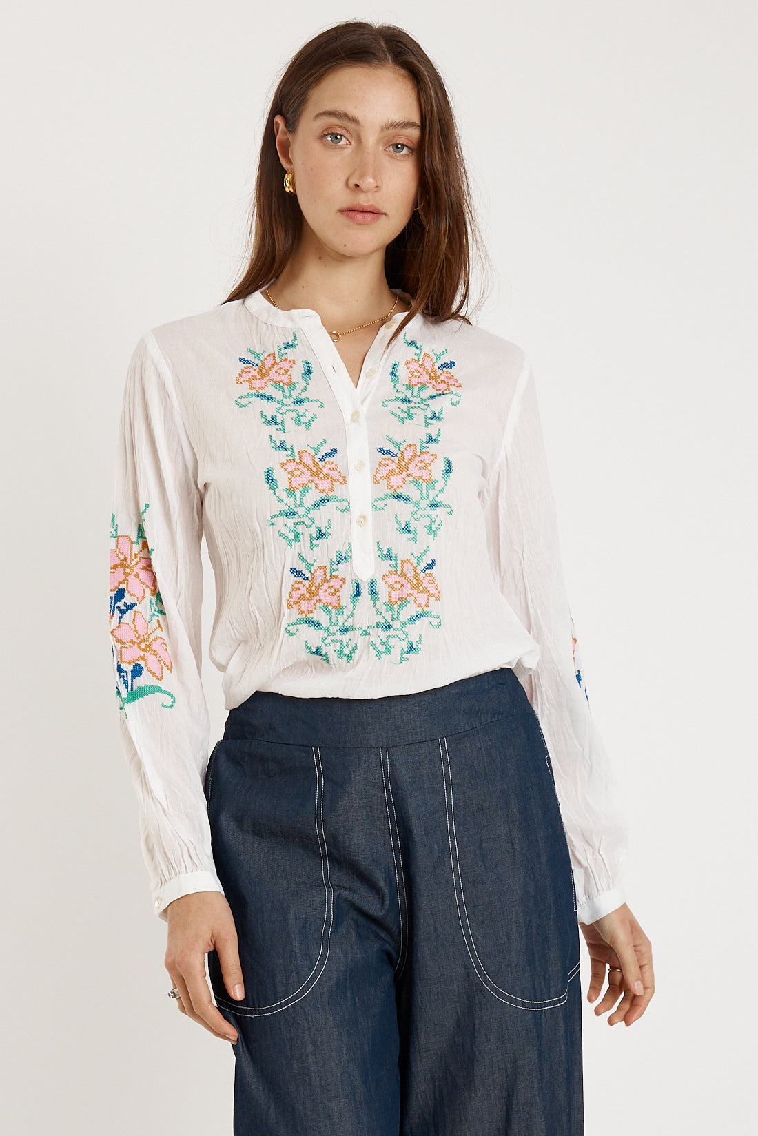 Elevate your wardrobe with the Rubyyaya Brittany Top, a perfect blend of comfort and contemporary style. Crafted from 100% premium cotton, this top feels soft against the skin while keeping you effortlessly chic. Featuring intricate embroidered detailing on the bodice and sleeves, the design adds a subtle yet luxurious touch. The full-length sleeves and classic round neckline make it versatile for any occasion, from casual brunches to evening outings. Designed in Australia, the Brittany Top reflects a modern, feminine aesthetic with timeless appeal.