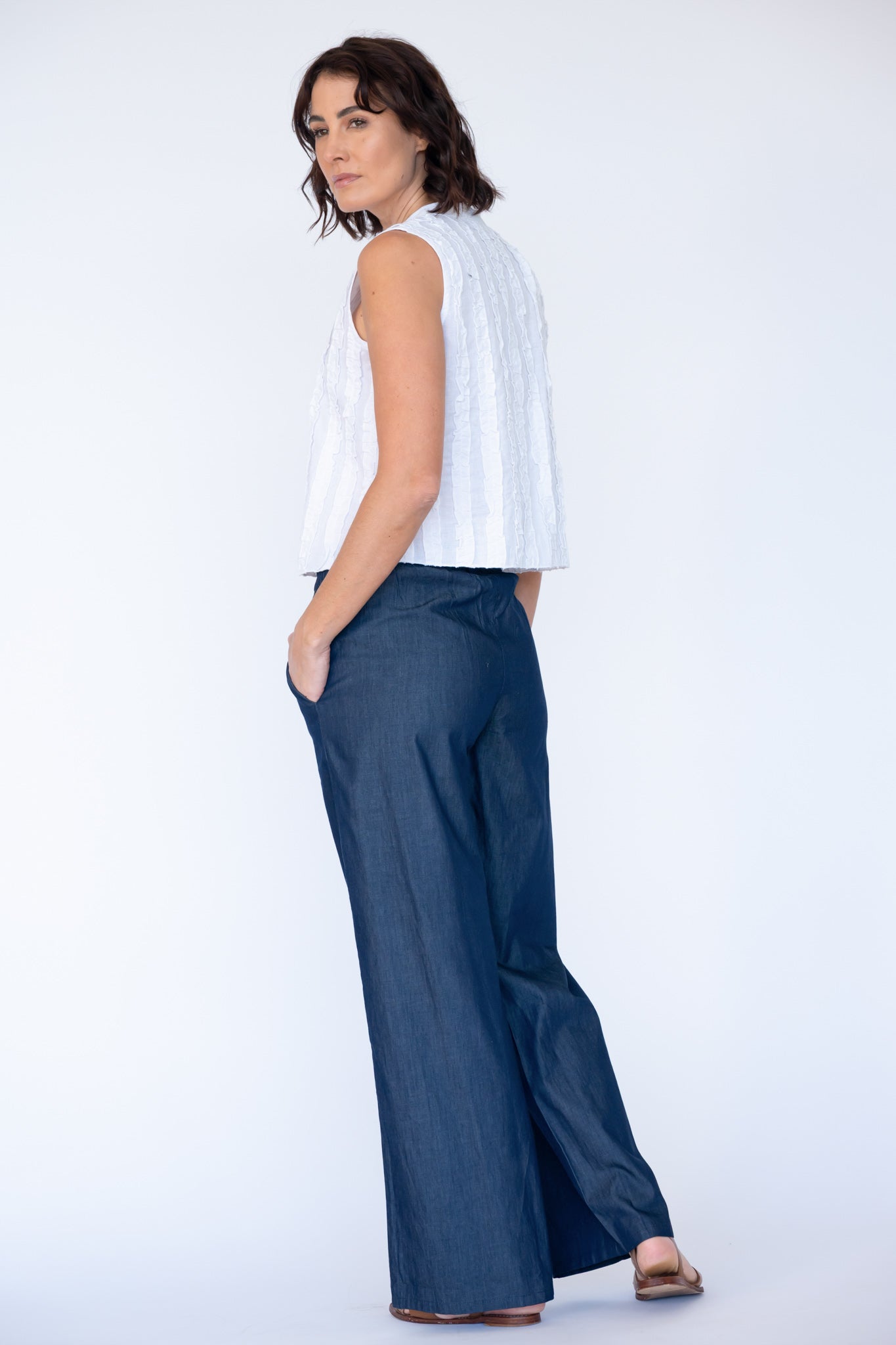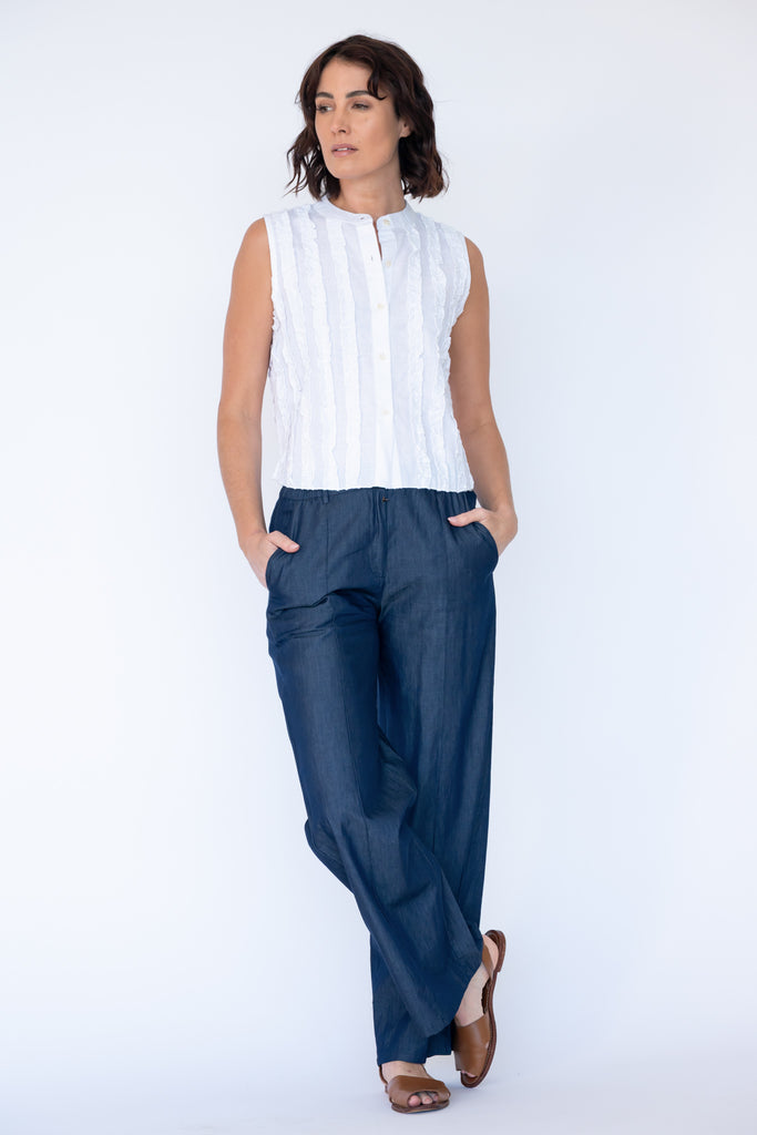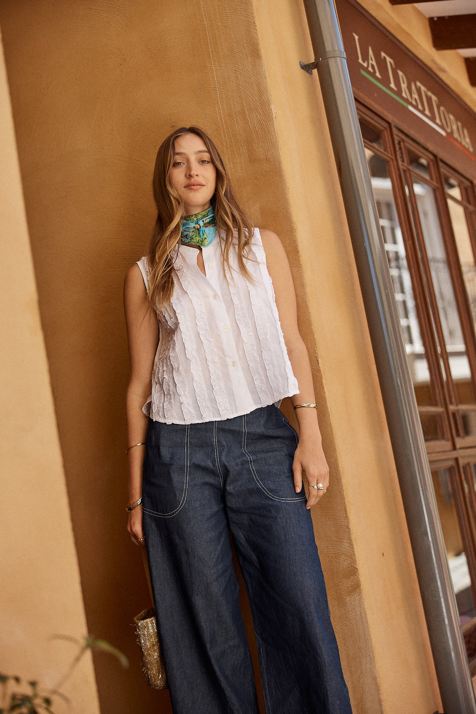 Radiate effortless charm in the Rubyyaya Camargue Top, a timeless piece crafted from 100% breathable cotton. Designed in Australia, this top features a frilled bodice detail that adds a soft, feminine touch to your everyday wardrobe. The round neckline and front button closure offer both comfort and versatility, perfect for layering or wearing solo.