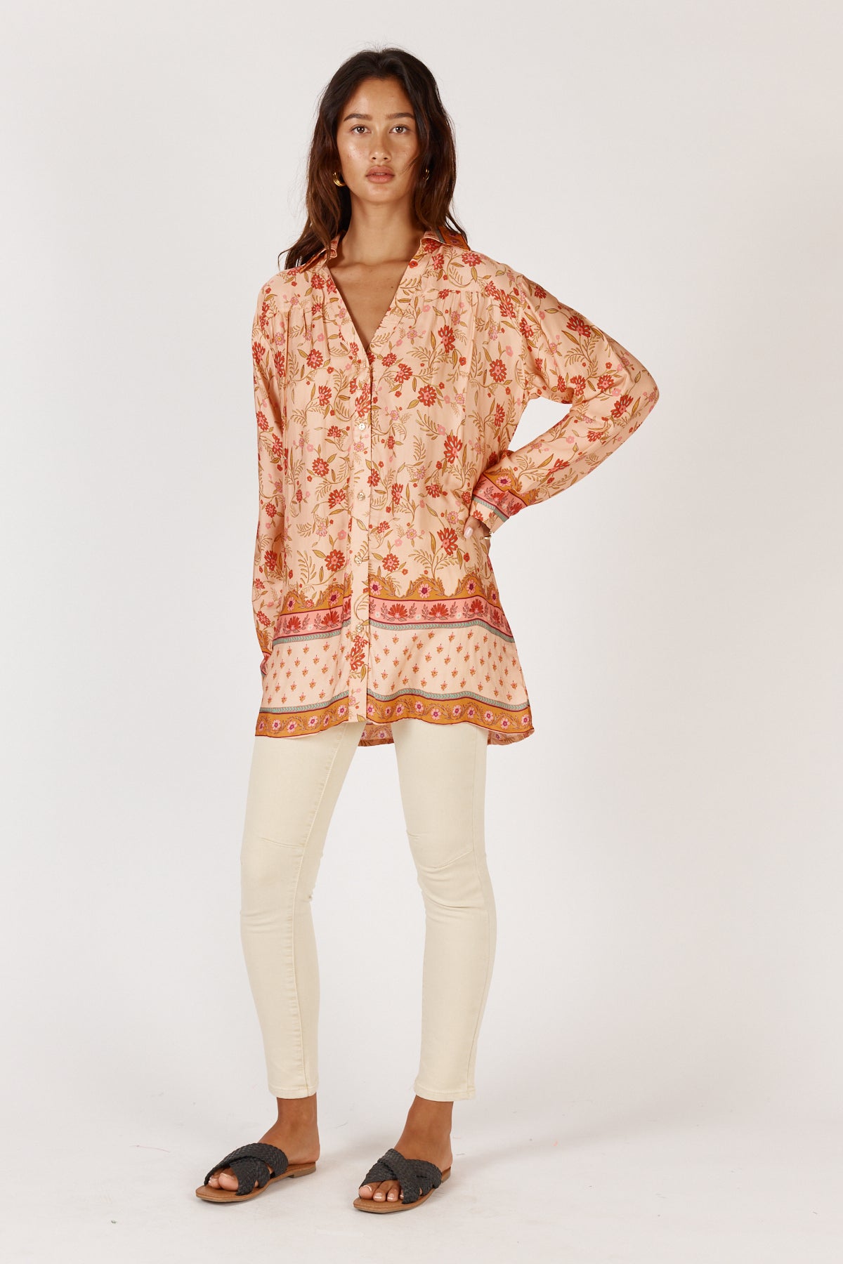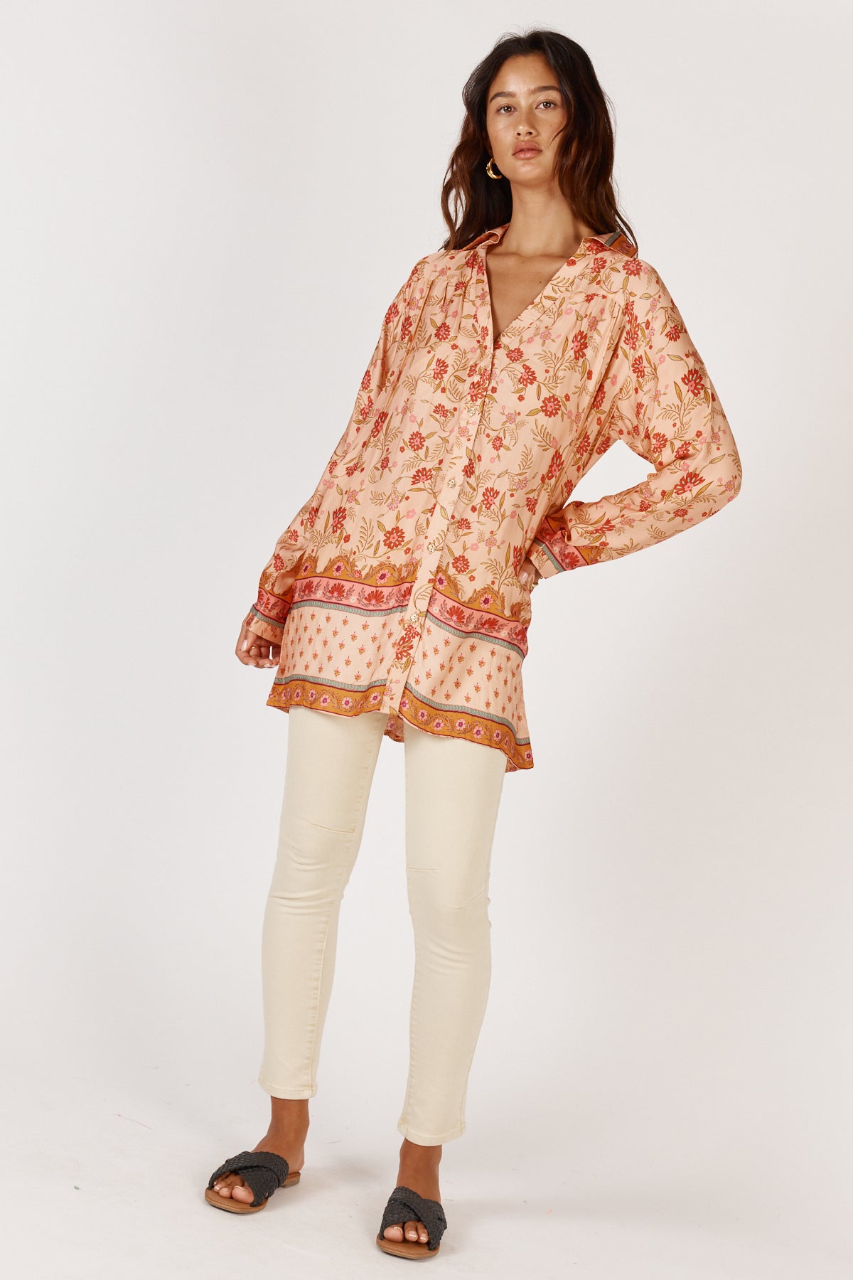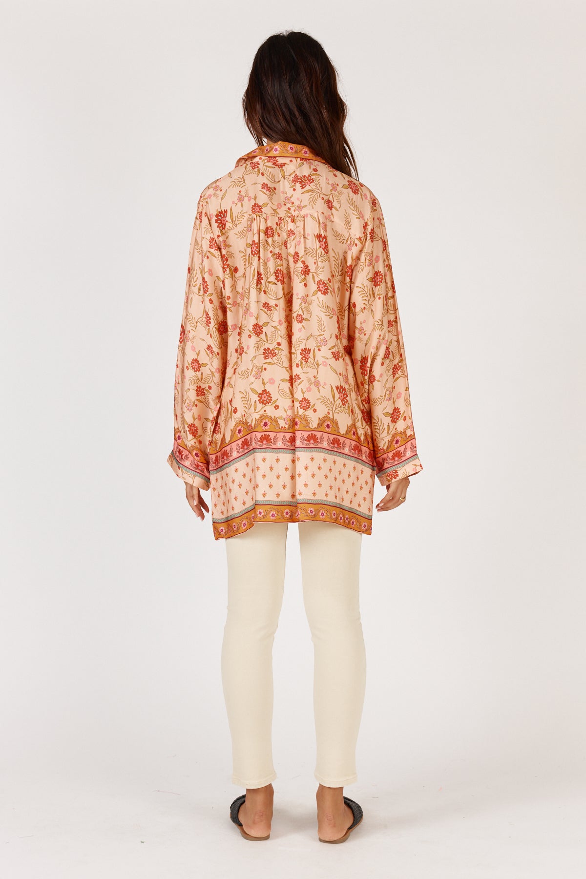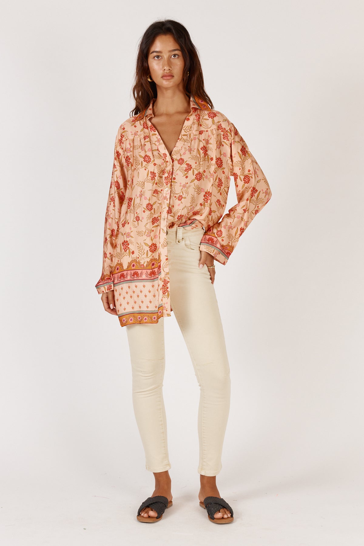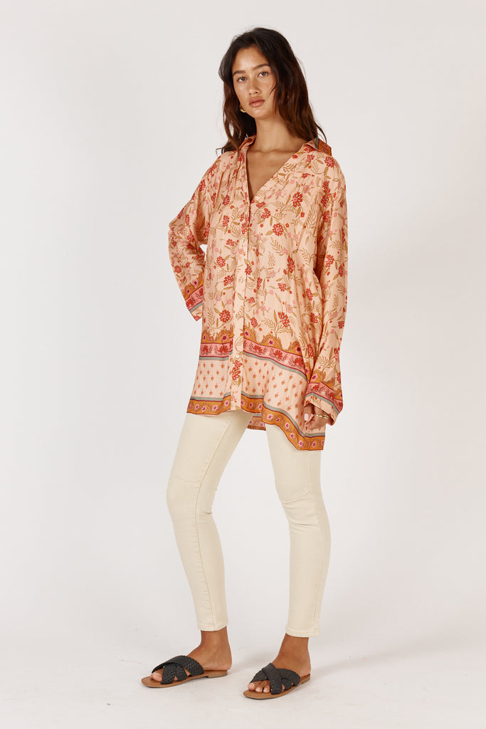 Elevate your wardrobe with the Rubyyaya Ivy Shirt in Gold, a sophisticated piece that seamlessly transitions from day to evening. Crafted in luxurious modal satin, this extended-length shirt drapes beautifully with an effortless elegance. The classic button-through design offers versatile styling options—wear it as a standalone statement or layer it with ease