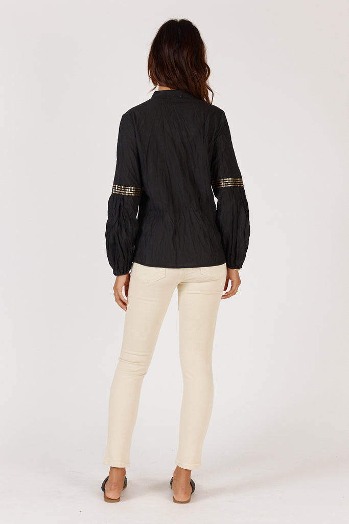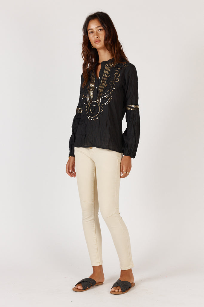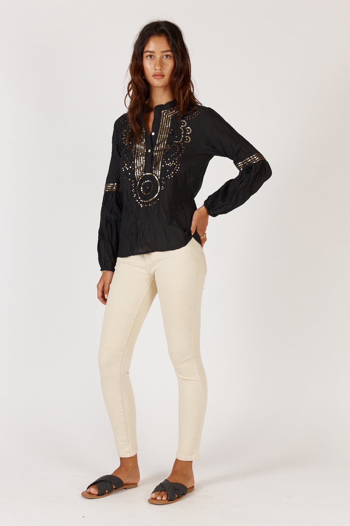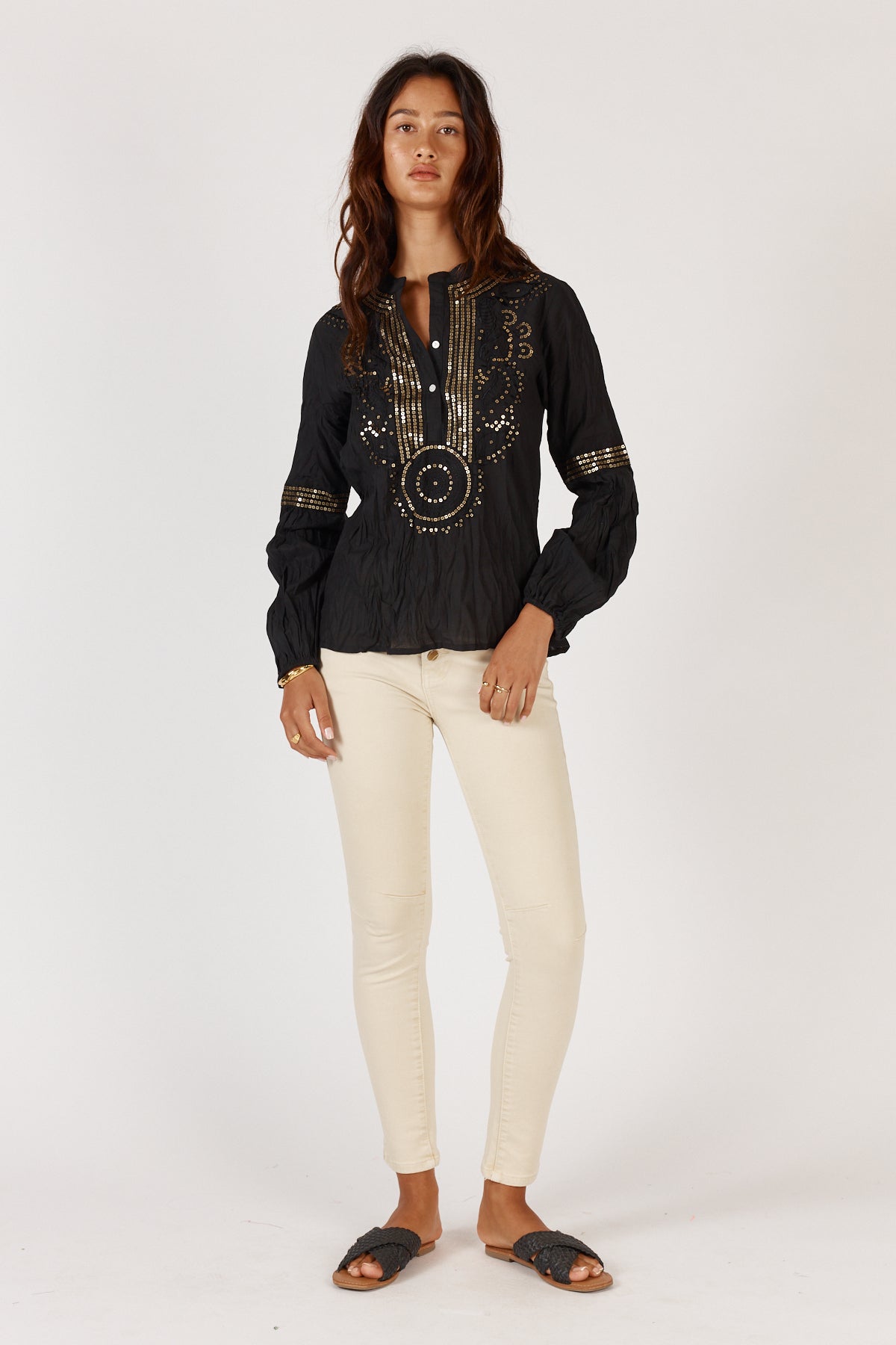 Elevate your everyday style with the Rubyyaya Moonshine Shirt, crafted from 100% cotton for breathable comfort. Featuring a flattering V-neckline, mandarin collar, and full-length sleeves with elastic cuffs, this shirt is adorned with intricate embroidery and matte gold sequin detailing for a subtle sparkle. True to size and easy to care for with a gentle machine wash, it’s the perfect fusion of relaxed elegance and artisan craftsmanship. Designed in Australia, this versatile piece transitions effortlessly from day to night.