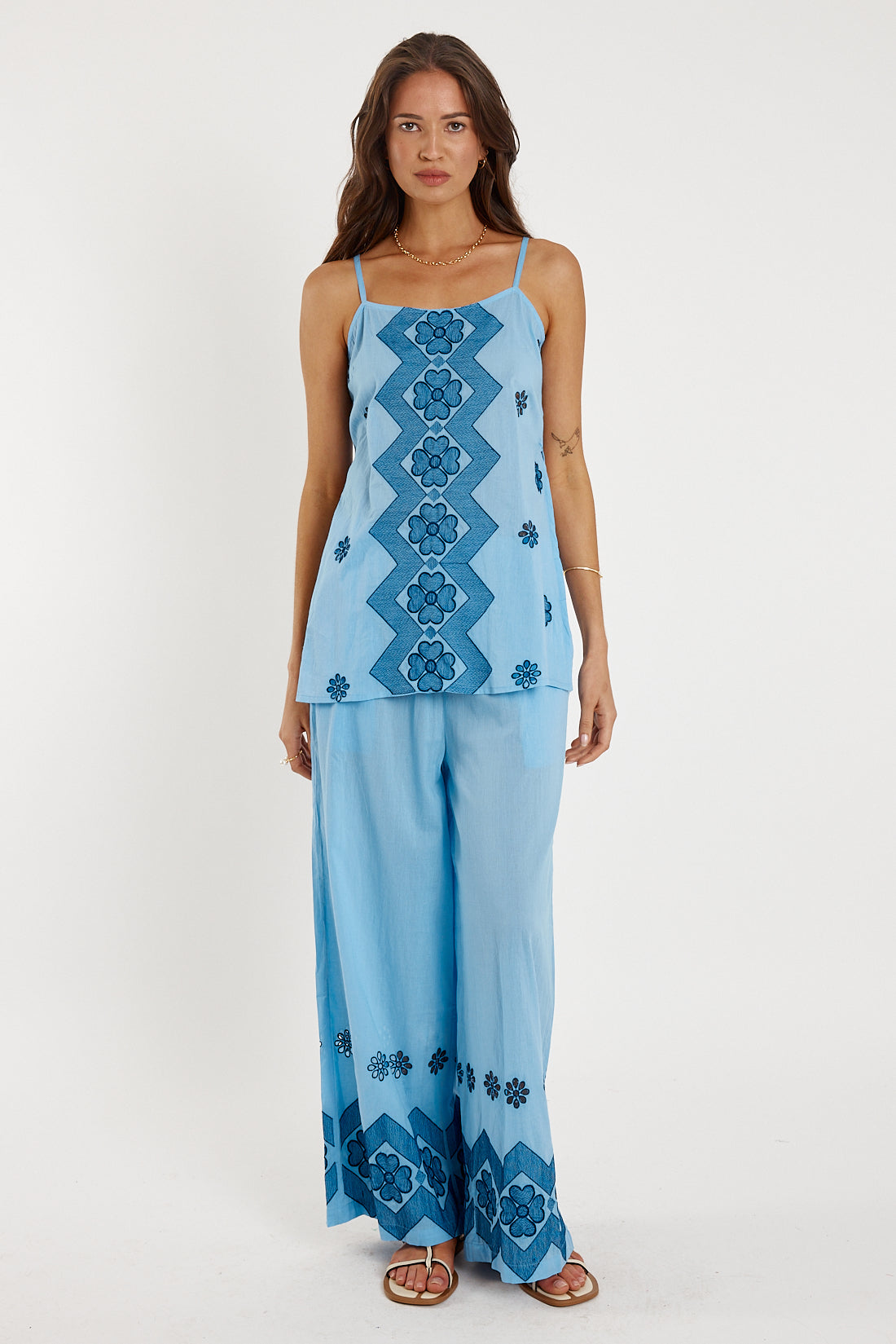 The Ravello Top in Blue combines timeless elegance with thoughtful design details. Crafted from 100% cotton, this piece offers breathable comfort for everyday wear. Delicate embroidered fabric adds visual interest and refinement, while adjustable straps ensure a customized fit for any silhouette. Practical side splits provide ease of movement and a flattering drape. A versatile wardrobe essential that transitions effortlessly from day to evening.