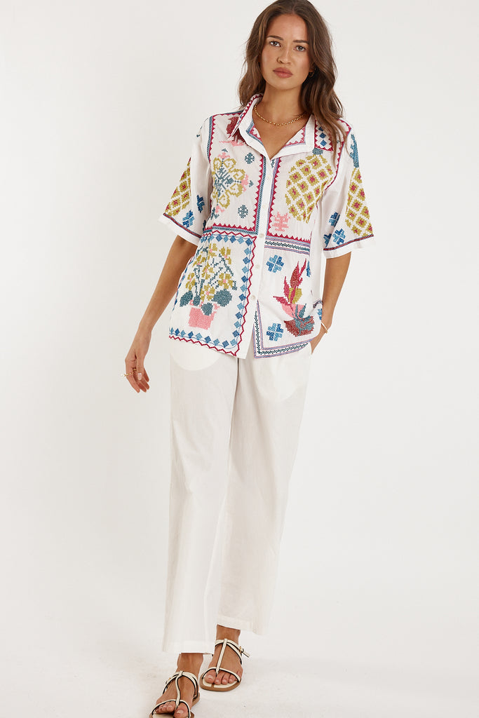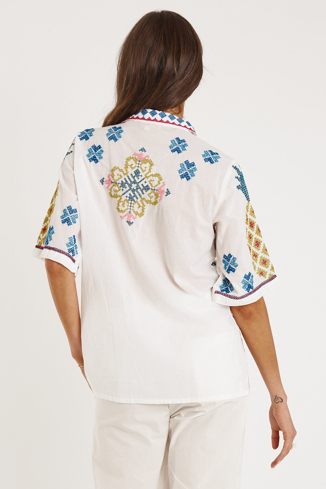 Elevate your everyday style with the Rubyyaya Sanchez Shirt, a modern cotton shirt designed for effortless versatility. Crafted from 100% breathable cotton, this short-sleeve shirt features intricate cross-stitch embroidery that adds refined texture and a contemporary edge. The classic shirt silhouette keeps the look clean and polished, making it perfect for workdays, weekends, and everything in between. Designed in Australia, the Sanchez Shirt pairs beautifully with denim, linen pants, or tailored shorts for a fresh and modern wardrobe update.