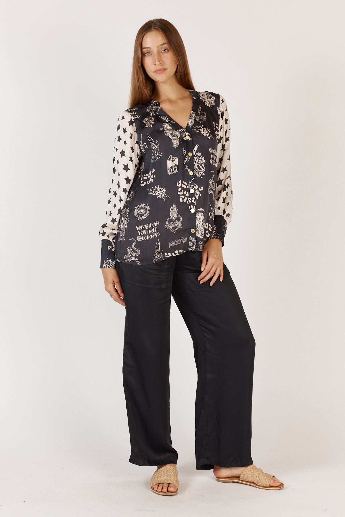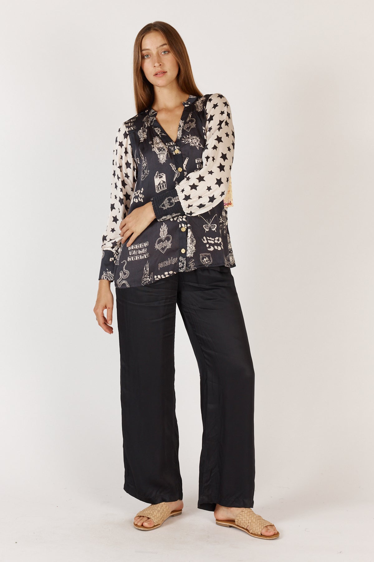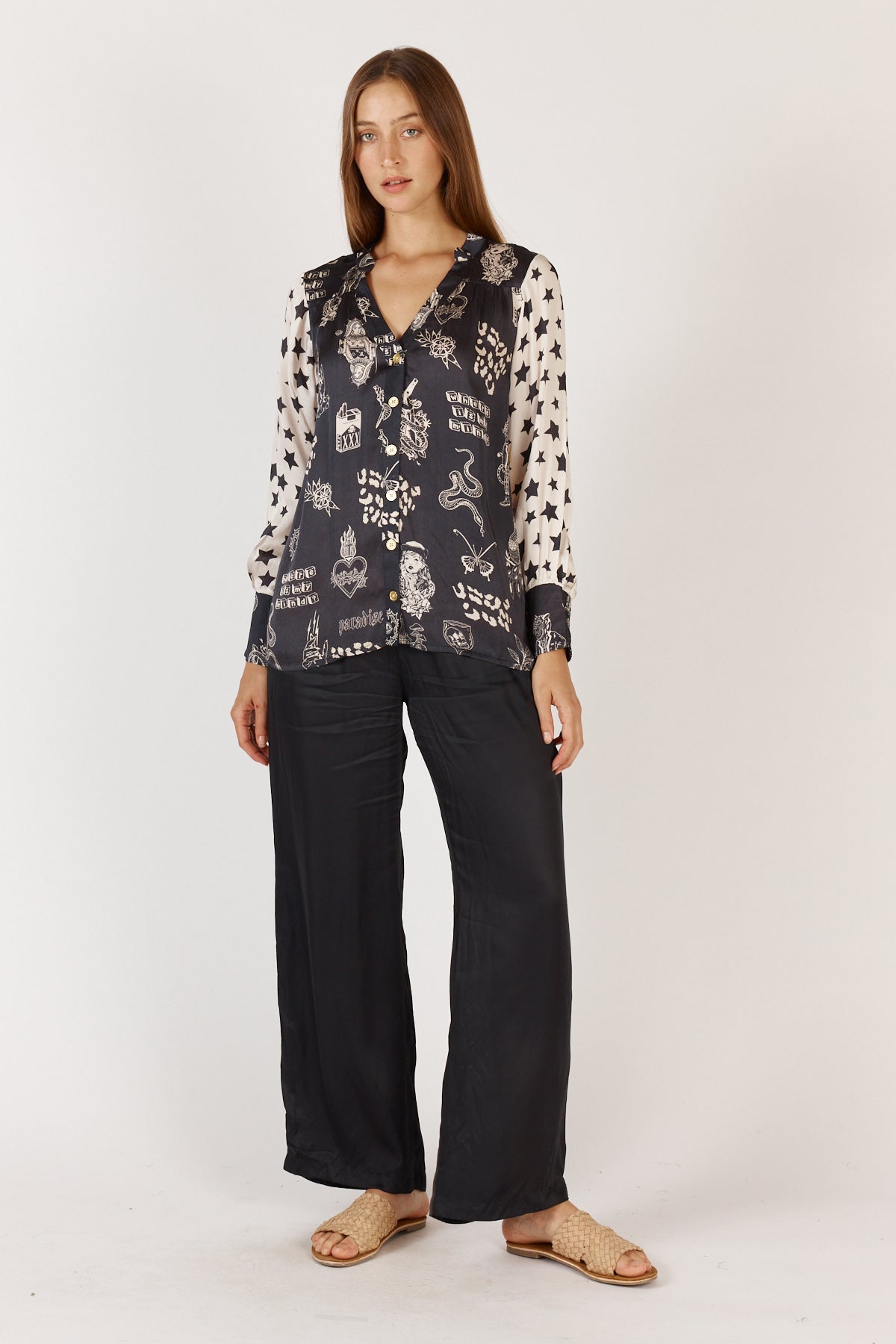 Elevate your everyday style with the Rubyyaya Sastri Shirt in Black. Crafted from luxurious 100% viscose satin, this tunic-style shirt features a flattering mandarin collar with a V neckline, creating a timeless, effortless silhouette. The relaxed fit ensures comfort, while full-length sleeves with elasticated cuffs add a touch of refined femininity. Designed in Australia and made in India, the Sastri Shirt is perfect for transitioning from work to weekend with ease. Pair with tailored pants for a polished look or wear with your favourite jeans for relaxed elegance. Gentle machine washable for easy care, it is your new go-to for breathable, lightweight style across all seasons.