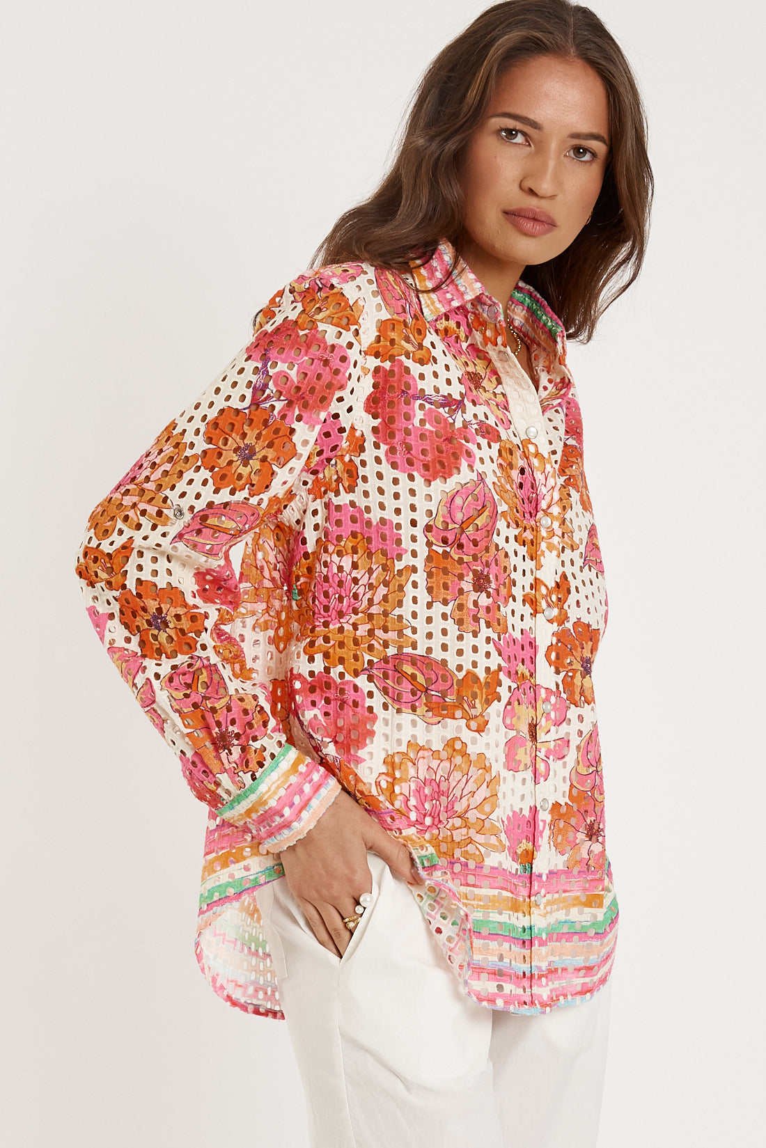 Fresh, feminine, and beautifully detailed, the Rubyyaya Sunrise Shirt brings elevated texture to your everyday style. Crafted from soft cotton in delicate schiffli fabric, this long-sleeve shirt features a floral design that adds a modern, romantic touch. The collared neckline keeps the look polished, making it easy to dress up or down. Designed in Australia, it pairs effortlessly with denim, linen, or the matching Sunrise Pant for a coordinated, contemporary outfit.