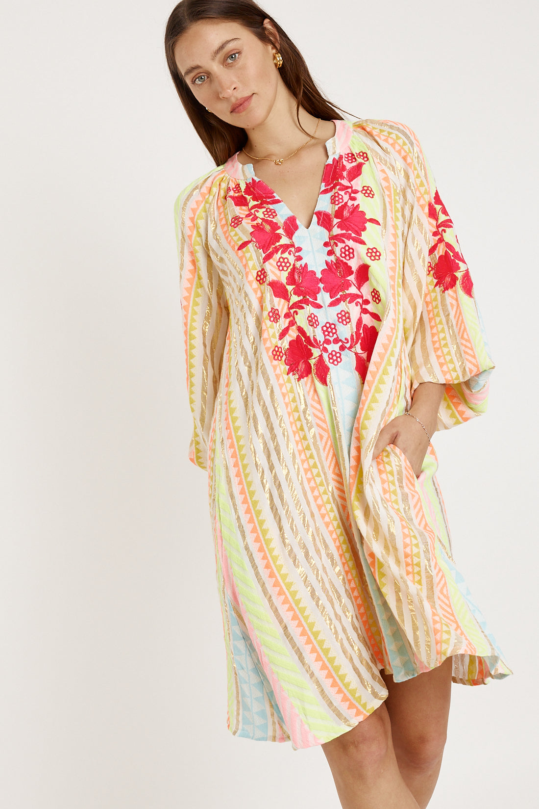 Elevate your wardrobe with the Rubyyaya Toulon Tunic Dress, a statement piece designed for effortless style. Crafted from 100% viscose, this oversized tunic drapes beautifully, combining comfort with contemporary elegance. The jacquard fabric shimmers subtly with lurex highlights, while the intricate embroidery on the bodice and sleeves adds a touch of artisanal charm. Complete with practical side pockets, this versatile dress is perfect for casual outings or dressed-up occasions. Proudly designed in Australia, it’s a piece that blends modern design with timeless sophistication.